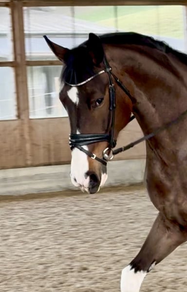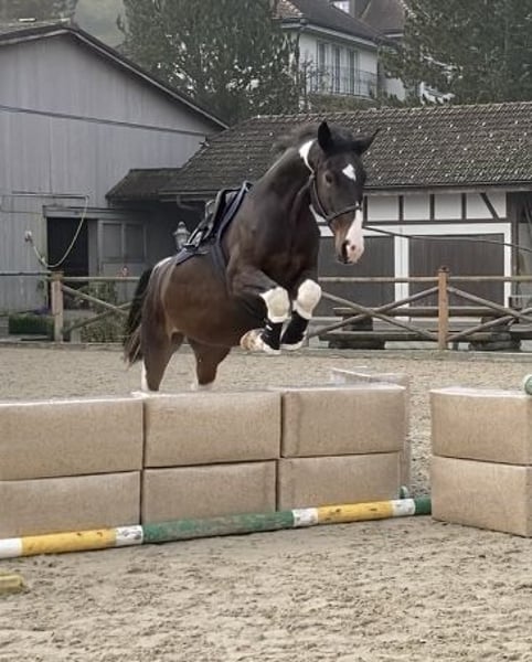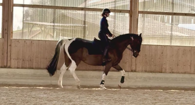 Cavalla pinto molto ben disegnata (100% ereditarietà del colore - fa sempre colori!) e di grande corporatura, direttamente dall'allevatore. Alcuni mesi sotto sella e anche testata in terreno. Addestrata da W. Gegenschatz (istruttore Pat Parelli). La cavalla va scalza con altri cavalli nel branco ed è piacevole da gestire e con i suoi simili. Proveniente da una linea molto fertile e regolarmente in calore. Vendita preferita a una persona privata che si prenda la cura e il tempo per la sua ulteriore formazione e lavoro quotidiano.