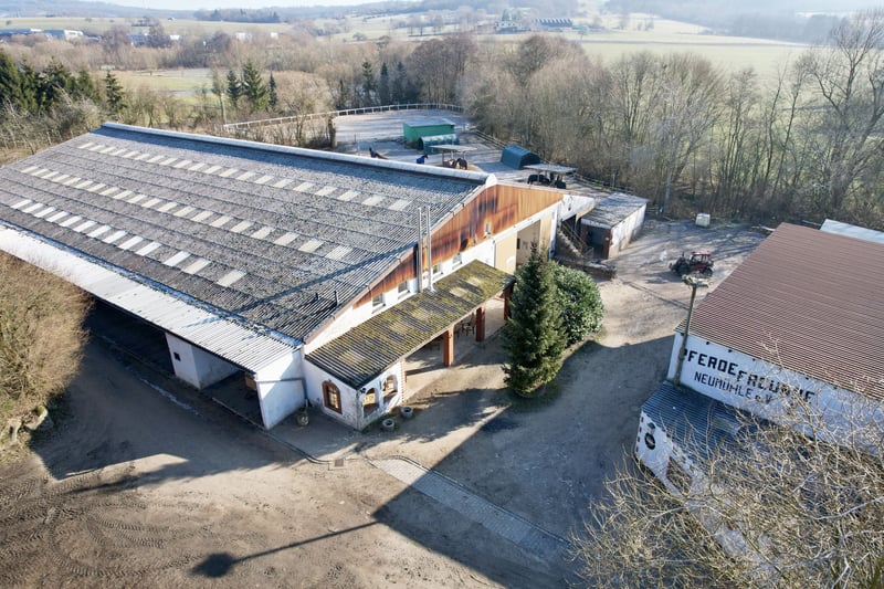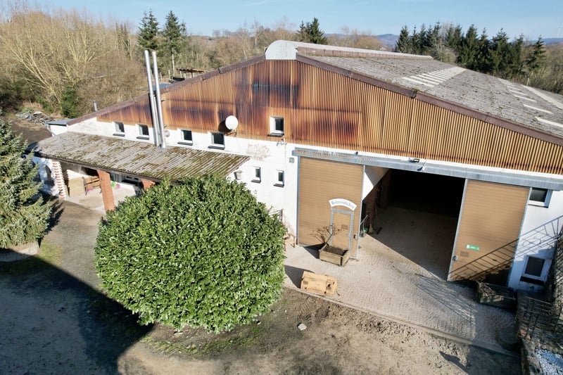 A paradise for horse lovers - your chance to own an exclusive riding facility! With a total area of approx. 12 hectares (and the option of further pasture land), this property offers everything that makes the heart of equestrian sports enthusiasts beat faster. Whether for ambitious horse owners, breeders or as a lucrative investment - you will find the perfect conditions here. The high-quality facilities, first-class infrastructure and idyllic location make this property unique. The modern indoor riding arena with a 20x40m riding area has a high-quality HEUS tarmac floor and riding arena mirrors from Equus Design, which can be optionally purchased by the club. There is a versatile storage area on the short rear side of the hall, which is also suitable for use as an open stable. Two spectator galleries also complete the overall picture. The large stable building is optimally divided. There are a total of 15 paddock boxes on the right-hand side, including 13 boxes measuring 3x4m with adjacent 3x6m paddocks, one paddock box with 4x4m and 4x6m paddocks and another with 5x4m and 5x6m paddocks. The left-hand side of the stable wing offers a comfortable grooming area with a height-adjustable solarium from Equus, direct access to the indoor riding arena, a tack room with 15 spacious army lockers and a feed room with three integrated silos in the ceiling, each holding 4-5 tons, an oat crusher and a feed trolley. There is also a further tack room with additional army lockers and five spacious indoor boxes, each measuring 3x4m, two of which have high-quality large hay racks. In front of the stables there is a covered grooming area and an outdoor grooming area with hosing down facilities. Below the stable there is a large outdoor paddock with two wooden hayracks and two pasture tents covering an area of around 700m². This was only newly built this year. The upper outdoor boxes on the opposite side of the stable comprise six spacious boxes, four of which are 3.5x3.5m each and two of which are 5x3.5m. A small tack room with water connection and a separate hay store provide additional storage space. There are also five outdoor paddocks, each with an area of around 300m² and wooden hay racks. There are two riding arenas for daily training: The upper riding arena measures approximately 25x50m and has a sand surface, while the lower riding arena measures approximately 25-35x55m and has a high-quality HEUS castle park sand surface. The lower arena has white fencing from Schmaus, a modern floodlight system and a practical "judges' hut" for storing obstacle material. The cozy riding room with approx. 50m² offers a direct view into the riding hall and is equipped with a projector, screen, a fixed bar counter with kitchen and an additional wood-burning stove. This was also used as a training room. Heated men's and women's toilets provide additional comfort. A further room next to the parlor serves as a storage area with army lockers and contains a washing machine, a gas boiler and a hot water tank. There is also a cistern of unknown size. An outdoor terrace completes the cozy lounge area. The two galleries of the indoor riding arena offer further possibilities for use: Gallery 1 houses a staff apartment with 45-50m² of living space, air conditioning from LG, gas heating and an Ikea kitchen, as well as an additional heated room with 24m². Gallery 2 serves as a further spectator area with storage space for lockers and equipment. The facility also includes two large warehouses that can be used in a variety of ways. The upper storage hall offers space for hay and straw and has a workshop in the upper area as well as additional parking and storage areas below. The lower warehouse can also be used for hay/straw storage or as an open stable. The riding facility has been regularly modernized and maintained. The most important investments include the new construction of the lower riding arena with drainage (2014), the renovation of the riding hall floor (2016), a new gas boiler (2018) and extensive renovations, including the riders' lounge (2020) and the staff apartment with installation of air conditioning (2023). In recent years, numerous fences have also been renewed, new wooden hay racks installed and modern lighting systems purchased. Although there is currently no residential building on the plot, we are convinced that all requirements could be met to obtain planning permission. Take advantage of this unique opportunity to realize your vision of a first-class equestrian facility! Contact us for more information or a personal viewing. Important facts at a glance: Plot size: approx. 12 hectares, optional further agricultural land of the owner for purchase or lease. Riding hall: 20x40m with HEUS quicksand floor, high-quality riding hall mirrors Stables: 15 spacious paddock boxes, 5 indoor boxes, 6 outdoor boxes, open stable options for additional horses Outdoor facilities: Two riding arenas (25x50m and 25-35x55m), large outdoor paddocks, Comfort & infrastructure: Riders' lounge with kitchen and projector, heated sanitary facilities, two galleries with staff accommodation Modern technology: floodlight system, height-adjustable solarium, integrated feed silos, oat crusher Storage areas: Two large storage sheds for hay, straw and workshop facilities Ongoing modernization: New indoor riding arena floor, improved fencing, new yard lighting, renovation of the riders' lounge and staff apartment, new outdoor paddocks LOCATION Elsoff (Westerwald) is a local community in the Westerwald district in Rhineland-Palatinate and is part of the Rennerod municipality. The community is located in a picturesque rural setting, surrounded by rolling hills, dense forests and wide meadows, making it an ideal place for nature lovers. Elsoff has good transport connections: Road access: The nearest major towns are Siegen, Montabaur and Limburg an der Lahn, each of which can be reached within half an hour by car. Highway connections: The p