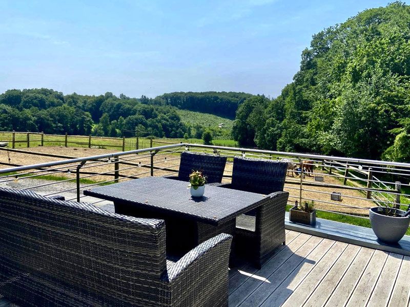 Objektbeschreibung: Dieses einzigartige Anwesen vereint auf perfekte Weise modernes, komfortables Wohnen mit einer professionell ausgestatteten Pferdehaltung. Gelegen in einer idyllischen, pferdefreundlichen Umgebung mit hervorragender Anbindung an die Natur und dennoch nahe wichtiger Infrastruktur, bietet dieser Reiterhof die ideale Grundlage für private Reitsportler, Züchter oder den Aufbau eines Tierhofes. Das Herzstück des Anwesens bildet das 2014 in hochwertiger Okal-Bauweise errichtete Einfamilienhaus. Es besticht durch seine moderne Architektur, lichtdurchflutete Räume und eine energieeffiziente Bauweise und ist in einem bezugsfertigen Zustand. Ein großzügiger, offener Wohnbereich, hochwertige Bodenbeläge, eine moderne Einbauküche, vier Schlafzimmer, ein Büro und zwei stilvolle Badezimmer unterstreichen die Wohnqualität und bieten einer Familie ausreichend Platz. Die große Dachterrasse bietet Raum für Ruhe und Entspannung, Ihre Pferde haben Sie stets in Blickweite. Für den anspruchsvollen Pferdehalter ist diese Anlage ein echtes Highlight, das keine Wünsche offen lässt. Die Funktionalität und das Wohl der Tiere standen bei der Planung im Vordergrund: Eine großzügige, gut belüftete Reithalle mit Kirchhellener-Spezialsand und Sprinkleranlage bietet das ganze Jahr über beste Trainingsbedingungen, unabhängig von der Witterung. Insgesamt gibt es 12 Pferdeboxen in der Boxengasse mit eigenem Paddock, konzipiert für das Wohlbefinden Ihrer Tiere. Zahlreiche eingezäunte Weideflächen mit Wasserleitung, ein beleuchtbarer Außenreitplatz , sowie ausreichend Lagerflächen für Futter und Technik in Form einer Scheune komplettieren das Angebot. Die Liegenschaft befindet sich in einer gefragten ländlichen Region, bekannt für ihre ausgezeichneten Reitwege und die naturnahe Erholung an der Bevertalsperre. Die Kombination aus privatem Wohnkomfort und erstklassiger Reitinfrastruktur macht dieses Objekt zu einer seltenen Gelegenheit am Markt. Entdecken Sie selbst die Harmonie zwischen modernem Wohnen und professionellem Reitsport. Dieses Anwesen ist mehr als nur ein Hof – es ist eine Lebensphilosophie. Für weitere Informationen und zur Vereinbarung eines Besichtigungstermins stehen wir Ihnen jederzeit gerne zur Verfügung. Lagebeschreibung: Hückeswagen ist eine charmante Stadt im Oberbergischen Kreis in Nordrhein-Westfalen, Deutschland. Mit einer Einwohnerzahl von etwa 15.000 Menschen bietet Hückeswagen eine überschaubare und dennoch lebendige Gemeinschaft. In Bezug auf die Infrastruktur verfügt Hückeswagen über alle notwendigen Einrichtungen für den täglichen Bedarf. Es gibt Schulen, Kindergärten, Ärzte, Apotheken und verschiedene Einkaufsmöglichkeiten, die eine gute Versorgung der Bevölkerung gewährleisten. Auch das Rathaus und andere öffentliche Einrichtungen sind gut erreichbar. Die Freizeitangebote in Hückeswagen sind vielfältig und attraktiv. Die Stadt liegt inmitten einer reizvollen Naturlandschaft mit Wäldern, Wiesen und der nahegelegenen Bevertalsperre. Diese bietet zahlreiche Möglichkeiten für Wassersport, Angeln und Bootsfahrten. Wander- und Radwege laden zu ausgedehnten Touren ein. Zudem gibt es Sportvereine, ein Hallenbad und kulturelle Veranstaltungen, die das Freizeitangebot bereichern. Hückeswagen ist verkehrstechnisch gut angebunden. Die Stadt liegt in der Nähe der Autobahn A1, die eine schnelle Verbindung zu den umliegenden Städten Wuppertal, Essen, Düsseldorf, Köln und Dortmund ermöglicht. Auch der öffentliche Nahverkehr ist gut ausgebaut, sodass man bequem mit Bussen die Nachbarorte erreichen kann. Zusammenfassend lässt sich sagen, dass Hückeswagen eine attraktive Stadt mit einer guten Infrastruktur, vielfältigen Freizeitangeboten und einer guten Verkehrsanbindung ist. Die naturnahe Lage und die freundliche Gemeinschaft machen Hückeswagen zu einem lebenswerten Ort. Ein Traum für Naturliebhaber, die Ruhe und ein Leben in der Natur suchen. Energieangaben: Bedarfsausweis, Endenergiebedarf 69,94 kWh/(m²*a), wesentlicher Energieträger: Flüssiggas, Baujahr: 2014, Energieklasse: B. Courtagepassus: Der Makler-Vertrag mit uns kommt durch die Beauftragung der Maklertätigkeit in Textform (z.B. E-Mail mit Bestätigung der gewollten Inanspruchnahme) zustande. Die Höhe der Courtage richtet sich nach den ab dem 23.12.2020 in Kraft getretenen gesetzlichen Regelungen zur Teilung der Maklercourtage. Hiernach wird die Courtage regelmäßig für beide Parteien (Eigentümer und Käufer) jeweils in Höhe von 3 % zuzüglich Umsatzsteuer in jeweils geltender Höhe, derzeit also insgesamt 3,57 % des Kaufpreises einschließlich Umsatzsteuer bei notariellem Vertragsabschluss verdient und fällig. Die Höhe der Bruttocourtage unterliegt einer Anpassung bei Steuersatzänderung. Grunderwerbsteuer, Notar- und Gerichtskosten trägt der Käufer.