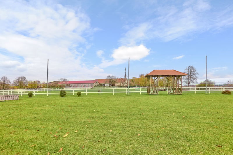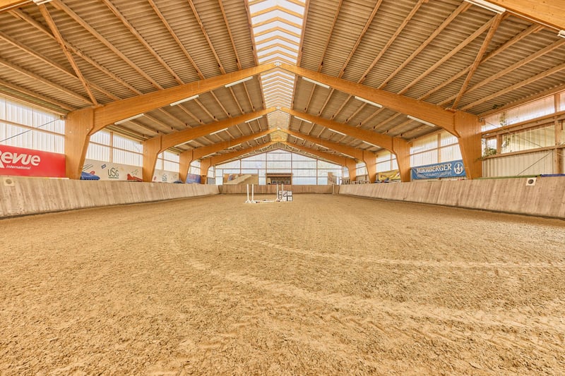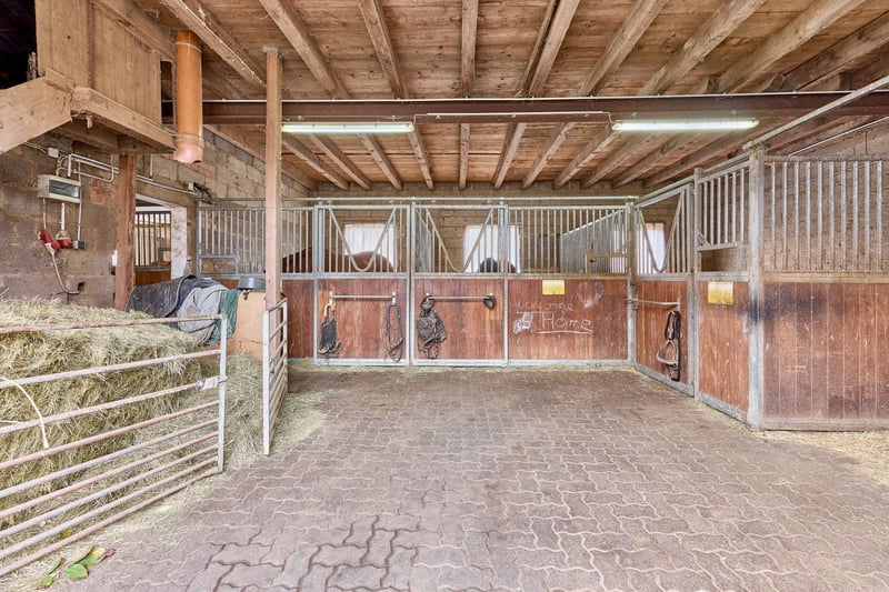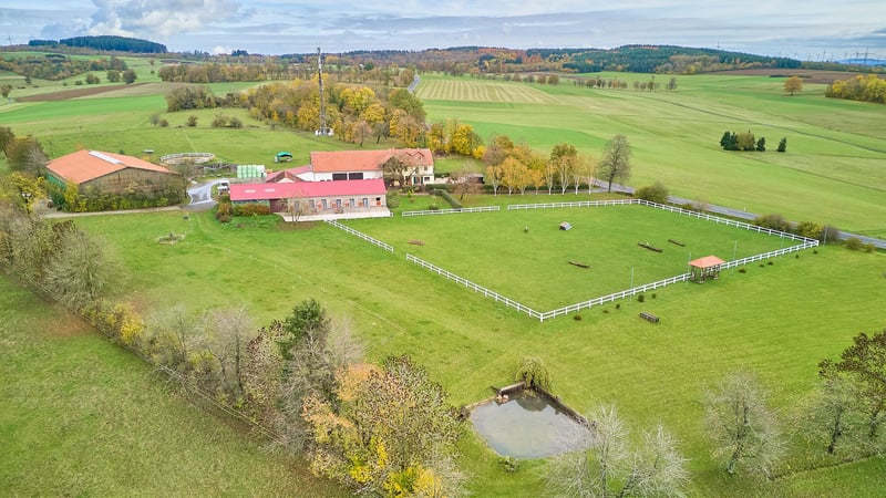 Bitte füllen Sie das nachfolgende Kontaktformular vollständig aus bevor Sie uns telefonisch kontaktieren. Vielen Dank für Ihr Verständnis! Reitanlage in Hessen zu verkaufen – absolute Alleinlage nur eine Stunde Fahrtzeit von Frankfurt am Main entfernt! Objektbeschreibung: Diese Reitanlage in Hessen liegt in einem Ortsteil von Birstein im Main-Kinzig-Kreis und besticht vor allem durch die exponierte Lage und die Kombination aus großzügigem Wohnkomfort und Trainingsbedingungen für den ambitionierten Reitsport. Das Anwesen erstreckt sich über ein Grundstück von ca. 83.879 m² im Alleineigentum, zusätzlich können ca. 17.500 m² gekauft oder auch nur gepachtet werden und weitere 25 ha Pachtfläche könnten ebenso langfristig übernommen werden. So wird eine wirtschaftliche Aufstellung des Betriebs ermöglicht. Das Landhaus verfügt über eine Wohnfläche von ca. 350 m², verteilt auf drei Wohneinheiten, darunter eine kleine Personalwohnung und zwei große Wohnungen. Die beiden großen Wohneinheiten lassen sich durch eine Verbindungstür problemlos zu einer Einheit zusammenfassen, sind jedoch bei Bedarf auch weiter trennbar. Das Gebäude wurde regelmäßig modernisiert, die Bäder und Küchen 2020 erneuert. Ausgestattet ist das Haus mit einer Luft-/Wärmepumpe und einer Ölheizung, sowie Fußbodenheizung und gemütlichen Kachelöfen. Ein großer Garten mit einem neuwertigen Außenpool aus 2021 sorgen für eine gewisse Exklusivität. Die Reithalle aus dem Jahr 2004 bietet mit 20 × 40 Metern Reitfläche und einem Sand-/Textilboden optimale Trainingsbedingungen. Die Leimbinderkonstruktion, großzügige Lichtbänder und ein angrenzendes Reiterstübchen sorgen für eine helle, funktionale und angenehme Reitatmosphäre. Ergänzend steht ein großer, drainierter Gras-Reitplatz, ein Longierzirkel (Ø 18 m) und eine Führmaschine für vier Pferde zur Verfügung. Die Stallungen wurden in den Jahren 1970, 1990 und 2020 errichtet bzw. modernisiert und bieten Platz für bis zu 32 Pferde, verteilt auf Paddockboxen, Innenboxen und Offenstallplätze. Sattelkammern und Putzplätze sind ebenso vorhanden. Eine große, geschlossene Bergehalle aus 1958 mit 350 m² bietet ausreichend Platz für Lagerung von rund 300 Rundballen. Die weitläufigen Weiden und Koppeln grenzen direkt an die Stallungen an und ermöglichen eine artgerechte Haltung mit viel Bewegung. Mehrere Offenställe auf den Weiden bieten ideale Voraussetzungen für die Zucht. Für den täglichen Ablauf stehen zudem eine genehmigte Mistplatte, ausreichend PKW-Stellplätze sowie ein Anhängerparkplatz zur Verfügung. Der Charme des Landhauses, die großzügigen Flächen und die ruhige Alleinlage machen dieses Anwesen zu einem Ort, an dem man sich sowohl im Alltag als auch im Reitsport sofort zuhause fühlt. Ausstattung: Wohnhaus: - Baujahr: 1958 Ursprung, An- und Ausbau in 1991, 2004 - Wohnfläche: ca. 350 m², 3 Wohneinheiten - Heizung: Öl aus 2010, Fußbodenheizung, Kachelofen, Luft-/Wärmepumpe im “Althaus” - Bauweise: Massivbauweise - Modernisierungen: Bäder und Küchen im Jahr 2020 - Fenster: Kunststoff-/ Holz, Doppel-Verglasung, Sprossenfenster (Bj.1985, 1991, 2004) - Dämmung: Dach und Zwischendecken - Großer privater Garten am Haus - Außen-Pool mit den Maßen 6,5 x 3,8 aus dem Jahr 2021 (beheizbar per Wärmepumpe) Reithalle: - Baujahr: 2004 - Reitfläche: 20 x 40 Meter - Boden: Sand-/Textilgemisch - Konstruktion: Leimbinder - Reiterstübchen mit Blick in die Reithalle Reitplatz (Vielseitigkeit): - Baujahr 2005 - Maße: 70 x 110 Meter - Boden: Gras, drainiert - Einzäunung vorhanden Unterbringung der Pferde: - Baujahr der Stallgebäude 1970, 1990 und 2020 - Tränken: Frostfreie Balltränken Offenstall, Suevia Umlauf in den Padockboxen - Maße: zwischen 3 x 3 und 3 x 4 Meter - Mehrere Sattelkammern vorhanden Insgesamt können untergebracht werden: 32 Pferde - 10 Paddockboxen - 4 Boxen ohne Paddock - 8 Laufställe für insgesamt 18 Pferde / Ponies Führmaschine: - Platz für 4 Pferde - Baujahr: 2020 - Boden: Gummiknochensteine Bergehalle: - Baujahr: 1958 - 350 m² Bruttogrundfläche (vollständig geschlossen) - Lagerung von rund 300 Rundballen - Boden: Beton Longierzirkel: - Baujahr: 2010 - Boden: Sand-/Textilgemisch, drainiert - Durchmesser 18 Meter - Einzäunung vorhanden Weiteres: - Ein Antrag an die Kreiswerke MKK ist bereits genehmigt für PV Anlage mit 24 kW - Genehmigte Mistplatte - Anhängerparkplatz, PKW Stellplätze Lage: Die Reitanlage befindet sich in einem Ortsteil der Gemeinde Birstein im hessischen Main-Kinzig-Kreis. Über die Bundesstraße B276 und die B457 besteht eine schnelle Anbindung in Richtung Gedern, Gelnhausen und Büdingen. Von dort aus sind die Autobahnen A66 (Frankfurt–Fulda) und A45 (Hanau–Gießen) in kurzer Zeit erreichbar. Die Bahnhöfe in Wächtersbach und Gelnhausen bieten Anschluss an den Regional- und Fernverkehr mit direkter Verbindung nach Frankfurt am Main, Hanau und Fulda. Der internationale Flughafen Frankfurt (FRA) ist mit dem Auto in etwa 60–70 Minuten erreichbar, ebenso der Flughafen Frankfurt-Hahn in rund 90 Minuten. Die Gemeinde bietet eine hohe Lebensqualität in naturnaher Umgebung. Der Ortsteil ist Teil der familienfreundlichen Gemeinde Birstein, die für ihr reges Vereinsleben, eine gute Grundversorgung und ihre idyllische Lage im Naturpark Vogelsberg bekannt ist. Im Ort selbst und in den umliegenden Ortsteilen finden sich zahlreiche Vereine, die ein vielfältiges Freizeit- und Gemeinschaftsangebot schaffen – von Reit- und Sportvereinen über Feuerwehr- und Musikvereine bis hin zu kulturellen Initiativen. Für den täglichen Bedarf stehen in Birstein und den Nachbargemeinden Einkaufsmöglichkeiten, Bäckereien, Metzgereien, Banken und Gastronomie zur Verfügung. Ein größerer Einzelhandels- und Supermarktstandort befindet sich im nahen Wächtersbach, nur wenige Fahrminuten entfernt. Im Bereich Bildung verfügt Birstein über eine Grundschule sowie eine Gesamtschule mit 