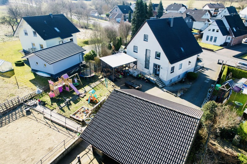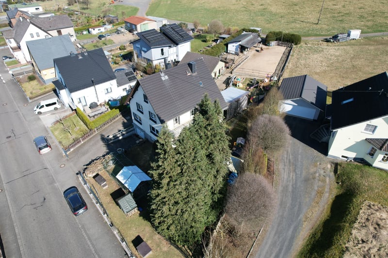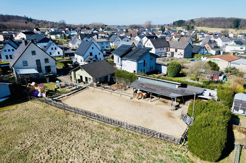 Dream Single-Family Home with Private Horse Keeping For sale is a unique single-family home in a quiet location on the outskirts of Bellingen in the idyllic Westerwald. This special property, built in 1960, combines rural charm with modern living standards and offers nature lovers, animal enthusiasts, and horse owners a home with many possibilities for development. Layout and Living Comfort: With a living area of approximately 185 m² spread over three floors, the house provides ample space for the whole family and is ideal for multi-generational living. A total of seven spacious rooms are available, including four bedrooms and a large living room. The rooms are bright, friendly, and offer a pleasant living atmosphere without any walk-through rooms. Two bathrooms, equipped with a shower and bathtub, as well as a separate guest WC, ensure high living comfort. The new fitted kitchen from 2024 impresses with an adjoining pantry and offers plenty of space for cooking enthusiasts. Thanks to existing connections on the upper floor, a second kitchen can be installed, ideal for multi-generational living. Comprehensive Modernizations – Perfect for Today's Demands: This house has been extensively renovated in recent years and meets today's modern living standards. The complete renewal of electrical and water lines, as well as the in-wall wiring in 2019, provide safety and comfort. The roof, including insulation and double-glazed insulated windows, ensures efficient energy use. Additionally, the tiled floors have been modernized, and the spacious wood-burning stove in the entrance area has been installed. Idyllic Property and Animal Keeping: The spacious property covers a total of approximately 10,000 m², consisting of a 1,602 m² house plot and additional areas for horse keeping. The private pasture land (4,858 m²) and additional leased land offer ideal conditions for private horse keeping. A horse stable with three spacious boxes and a riding arena with drainage were built in 2005. A separate tack and feed room, as well as a paddock, are also available. Thanks to the private well, the supply of animals is always secured. Leisure and Relaxation in the Green: The newly tiled terrace (2024) and the balcony invite you to relax. An outbuilding from 1975, currently used as a tack and feed room, can also serve as a party or event room. The electric gate with a light barrier ensures safety and comfort. Additional Features: The non-smoking house features in-wall wiring for a sound system in the living room and high-voltage connections for craft work. Two garages offer space for vehicles and equipment. Facts at a Glance: • Living area: approx. 185 m² on 3 floors • Plot size: approx. 10,000 m² • Year built: 1960, solid construction • Rooms: 7 (including 4 bedrooms) • Bathrooms: 2 bathrooms, guest WC • Horse stable for 3-4 horses with riding arena • Outbuilding (built in 1975) • New fitted kitchen (2024) • Roof renovation including insulation and windows • Wood-burning stove + Viessmann oil heating • Private well, high-voltage connection • Electric gate, 2 garages Conclusion: This property has been comprehensively modernized and meets all the requirements for comfortable, modern living. It is a true paradise for animal lovers, nature enthusiasts, and people who appreciate peace and privacy in an idyllic setting. Schedule a viewing appointment today and be convinced by this special offer! Bellingen is a local community in the Westerwaldkreis in Rhineland-Palatinate and is part of the Verbandsgemeinde Westerburg. The village is located in a valley about seven kilometers northwest of Westerburg at an elevation of around 430 meters above sea level. With an area of 4.29 km² and a population of approximately 600, Bellingen offers a rural atmosphere. • Proximity to Montabaur and Limburg an der Lahn: Bellingen is only about 15 kilometers from Montabaur and about 25 kilometers from Limburg an der Lahn. Both are important transport hubs in the region. Montabaur has a modern train station on the high-speed line Cologne–Frankfurt, enabling quick connections to cities like Cologne, Frankfurt, and other metropolises. The ICE connections offer comfortable and fast travel for commuters or travelers. • Road Traffic: South of Bellingen runs the federal highway 255, which connects Montabaur with Herborn. This road provides good access to the regional road network. The nearest motorway junction is in Montabaur on the A3 motorway, which connects Cologne and Frankfurt am Main. Overall, Bellingen offers good accessibility due to its proximity to important traffic routes while maintaining the peace and charm of a rural community.