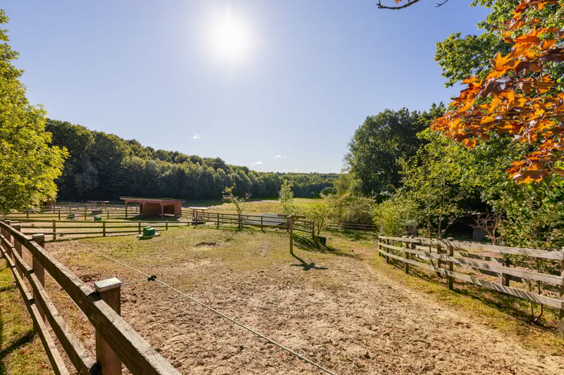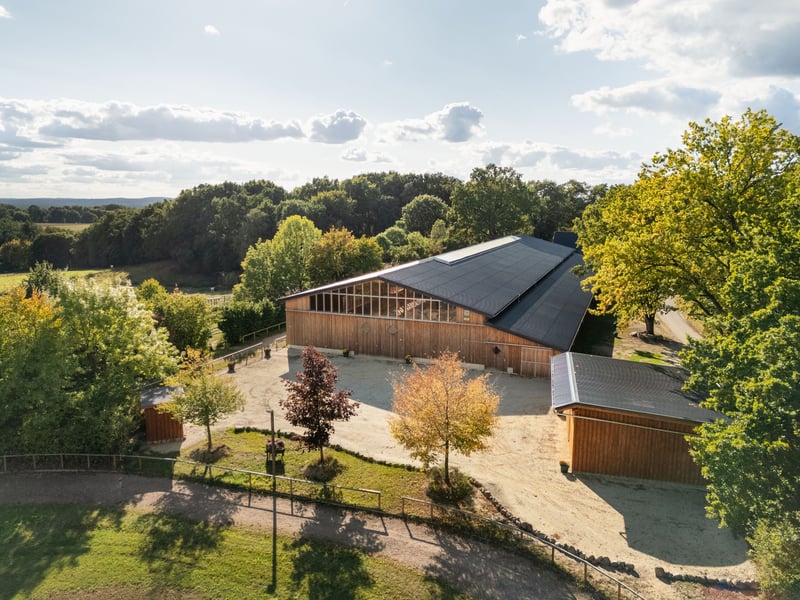 In herrschaftlich erhöhter Lage, eingebettet in eine malerische Landschaft aus sanft ins Tal abfallenden Feldern, präsentiert sich dieser eindrucksvolle Reiterhof als echtes Ausnahmeobjekt. Das Anwesen vereint Großzügigkeit, Funktionalität und Ästhetik auf höchstem Niveau – ideal für professionelle Pferdehaltung, ambitionierte Zucht oder gehobene private Nutzung. Das Gesamtareal umfasst rund 43 Hektar, davon 19 Hektar im Eigentum und weitere 24 Hektar Pachtflächen. Innerhalb des Eigentumsanteils befinden sich etwa 7,6 Hektar hochwertige Ackerflächen, die sich durch ihre ausgezeichnete Bodenqualität und vielseitige Nutzungsmöglichkeiten auszeichnen. Ob für Futterproduktion, Getreideanbau, Sommerweiden oder ökologische Blühstreifen – die Flächen liegen direkt am Hof und ermöglichen eine effiziente Bewirtschaftung und hohe Eigenversorgung des Betriebs. Reithalle – Herzstück der Anlage Das Herzstück der gesamten Anlage bildet die 2023–2024 neu errichtete Reithalle, die mit ihrer beeindruckenden Holzarchitektur und modernster Ausstattung höchsten Ansprüchen im Reitsport gerecht wird. Mit einer Größe von 30 × 80 Metern bietet sie ideale Bedingungen für Dressur-, Spring- und Freizeitreiter. Die Halle wurde in massiver Holzbauweise errichtet und mit einer hochwertigen Lärchenholzfassade versehen, die sich harmonisch in die Umgebung einfügt. Großzügige Fensterbänder und ein durchdachter Lichtfirst schaffen ein helles, freundliches Raumgefühl. Eine professionelle Beleuchtungsanlage sorgt für optimale Sichtverhältnisse – perfekt für Training und Unterricht. Die moderne Düsenrohrberegnung mit Nebeldüsen gewährleistet eine gleichmäßige Bodenfeuchte und konstant hohe Reitbodenqualität. Der Boden selbst ist dreischichtig aufgebaut und bietet ideale Elastizität, Griffigkeit und Schonung für Pferd und Reiter. Integriert sind zehn großzügige Übergrößenboxen (6 à ca. 24 m², 4 à ca. 34 m²) mit frostsicheren Tränken. Die Boxengasse wurde bewusst noch nicht ausgebaut, um individuellen Haltungsformen gerecht zu werden. Die Reithalle wird von einer angrenzenden Maschinen- und Gerätehalle ergänzt, die ausreichend Platz für Fahrzeuge, Heulager und Reitplatzpflege bietet. Stallanlagen und Infrastruktur Die Anlage umfasst insgesamt 25 Pferdeboxen – zehn in der Reithalle, neun im großen Stallgebäude, vier im kleineren Stall und zwei Außenboxen. Das große Stallgebäude aus dem Jahr 1955 wurde 2021 vollständig saniert und bietet auf rund 692 m² flexible Nutzungsoptionen. Hier befinden sich neben den Boxen auch Lager- und Futterräume, ein Einsteller-WC, eine Dusche sowie ein Aufenthaltsbereich. Der kleinere Stall (Baujahr 1990, modernisiert 2023) verfügt über zwei Innen- und zwei Außenboxen. Er wurde in massiver Holzbauweise errichtet, hochwertig beleuchtet und mit langlebigen Leichtzementdachziegeln ausgestattet. Direkt angrenzend befindet sich eine moderne Stallmeisterwohnung mit ca. 100 m² Wohnfläche und Einbauküche – ideal für Personal oder Eigennutzung. Ergänzt wird die Anlage durch eine überdachte Mistplatte, die sämtlichen modernen Umweltstandards entspricht. Sie ist auf einer massiven Betonplatte mit Gefälle errichtet, von stabilen Betonwänden eingefasst und mit großen Schiebetoren ausgestattet, die ein einfaches Befahren ermöglichen. Das robuste Dach schützt den Lagerbereich zuverlässig vor Witterung – ein Beispiel für durchdachte, nachhaltige Planung im gesamten Betrieb. Weiden, Paddocks und Außenanlagen Die weitläufigen Weide- und Paddockflächen sind hochwertig eingezäunt und pferdegerecht gestaltet. Massive Holz-, Litzen- und Elektrozäune aus langlebiger Eiche, Robinie und Douglasie gewährleisten Sicherheit, Langlebigkeit und eine ästhetisch harmonische Einbindung in die Landschaft. Insgesamt stehen acht großzügige Paddocks zur Verfügung – alle mit massiven Holzunterständen und frostsicheren Tränken, die eine artgerechte Haltung das ganze Jahr über ermöglichen. Durch die durchdachte Anordnung und Strukturierung der Flächen ist ein stressfreier Ablauf für Mensch und Tier garantiert. Eine hochwertige Ovalbahn (60 × 30 m) mit Trainerhäuschen und Rundumbeleuchtung erweitert die Trainingsmöglichkeiten erheblich – ideal für professionelles Arbeiten, Unterricht oder Lehrgänge bei jedem Lichtverhältnis. Durch die Kombination aus Eigentums- und Pachtflächen können 80 bis 100 Pferde artgerecht gehalten werden – eine Größenordnung, die nur selten in dieser Qualität und Vollständigkeit zu finden ist. Wohnhaus und Ferienhaus Das Wohnhaus aus dem Jahr 1900 wurde zwischen 2021 und 2023 aufwendig modernisiert. Auf 333 m² Wohnfläche vereint es historischen Charme mit modernem Wohnkomfort. Hohe Räume, edler Stuck, massive Holzfußböden und stilvolle Details verleihen dem Haus eine repräsentative, warme Atmosphäre. Das Dach wurde vollständig neu mit Tonziegeln eingedeckt, die Kupfergauben und Dachrinnen unterstreichen den hochwertigen Charakter. Das Ferienhaus mit rund 30 m² Wohnfläche, 1990 erbaut und 2024 umfassend modernisiert, bietet eine ideale Ergänzung – perfekt für Gäste, Ferienvermietung oder Reiter, die auf der Anlage verweilen. Dieses Anwesen ist weit mehr als ein landwirtschaftlicher Betrieb – es ist ein stimmiges Gesamtkonzept aus Reitsport, Natur und stilvollem Wohnen, das höchste Ansprüche erfüllt. Ein Ort, an dem Professionalität, Nachhaltigkeit und Lebensqualität harmonisch verschmelzen – ein Reiterhof, der in seiner Ausstattung, Lage und Atmosphäre seinesgleichen sucht.