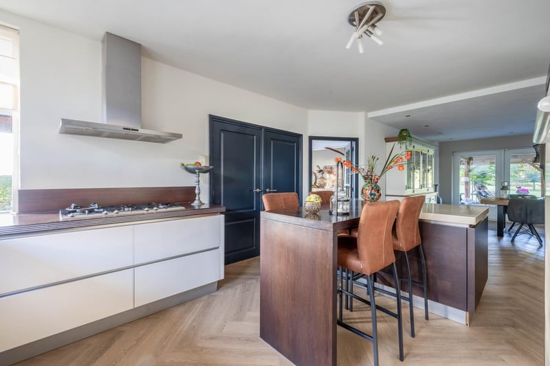 Komplette Reitsportanlage mit Einfamilienhaus, Wohnung, Büro, Reithalle mit Reithalle und insgesamt 31 Pferdeboxen, Außenplatz, überdachtes Laufband, Longierzirkel, mehrere Paddocks, Weide, Lager-/Feldscheune und freistehender Schuppen. All dies befindet sich auf einem großzügigen Grundstück von über 4 Hektar und bietet viele Möglichkeiten für den professionellen Pferdeliebhaber! HAUS Das freistehende Haus verfügt im Erdgeschoss über ein attraktives Wohnzimmer, eine Wohnküche, einen Hauswirtschaftsraum und einen Keller. Im 1. Stock befinden sich 3 großzügige Schlafzimmer und ein geräumiges Bad. Auf der 2. Etage befindet sich ein Dachboden. Der umliegende Garten ist schön angelegt und mit Rasen, Bepflanzung, Bäumen und mehreren Terrassen ausgestattet. Erdgeschoss: Die Eingangshalle ist mit PVC-Bodenbelag im Fischgrätenmuster, teilweise gemauerten/teilweise verputzten Wänden und einer Stuckdecke ausgestattet. Von der Halle aus gelangt man in das Wohnzimmer, in den Zählerschrank und über eine feste Treppe in den ersten Stock. Die Diele hat einen PVC-Boden im Fischgrätenmuster, teilweise gemauerte/teilweise verputzte Wände und eine Stuckdecke. Von der Diele aus gelangt man in das Wohnzimmer, in den Zählerschrank und über eine feste Treppe in den ersten Stock. Die geräumige Wohnküche ist ebenfalls mit dem gleichen PVC-Boden im Fischgrätmuster ausgestattet. Die Wände und die Decke sind verputzt. Die Küche ist U-förmig angelegt und hat eine Abstellinsel. Die Küche ist außerdem mit einem Geschirrspüler, einer Kombimikrowelle, einer Spüle, einem 5-flammigen Gasherd und einem Kühlschrank ausgestattet. Von der Küche aus gibt es einen Zugang zum Keller. Der Keller ist komplett gefliest und mit einem Kuckuck und einem Fenster ausgestattet. Es gibt feste Regale und eine Holztreppe. Eine Luke bietet Zugang zu den Räumen unter dem Haus. Der praktische Hauswirtschaftsraum ist teilweise gefliest und der Boden ist mit einem Fliesenboden mit Fußbodenheizung ausgelegt. Praktische Schiebeschränke bieten Stauraum. Hier befinden sich der Kombikessel der Zentralheizung, die Fußbodenheizung und die Anschlüsse für die Waschmaschine. Vom Hauswirtschaftsraum aus hat man Zugang zum Toilettenraum und zum Hof. Der Toilettenraum ist komplett gefliest und zusätzlich mit einem Handwaschbecken und einer schwimmenden Toilette ausgestattet. 1. Stock: Der großzügige Treppenabsatz bietet Zugang zu 3 geräumigen Schlafzimmern und einem Badezimmer. Das Schlafzimmer I ist mit Teppichboden ausgelegt, hat gespritzte Wände und eine gespritzte Decke. Von diesem Zimmer aus gelangt man über eine feste Treppe auf den Dachboden. Das Zimmer verfügt außerdem über einen praktischen Einbauschrank. Schlafzimmer II ist ebenfalls mit Teppichboden, gespritzten Wänden und einer gespritzten Decke ausgestattet. Feste Schiebeschränke bieten Stauraum. Das geräumige Badezimmer ist komplett gefliest und mit einer Badewanne, einer begehbaren Dusche, einem Waschbecken mit Unterschrank und einem Design-Heizkörper ausgestattet. Der Toilettenraum ist komplett gefliest und mit einer schwimmenden Toilette ausgestattet. Das sehr geräumige Hauptschlafzimmer wurde früher in zwei Schlafzimmer aufgeteilt. Dies ist relativ einfach wieder zu realisieren. Der Raum ist mit Teppichboden, Spachtelputzwänden und einer Spritzdecke ausgestattet. Ein praktischer Kleiderschrank und verschiebbare Schränke bieten Stauraum. Viele Fenster sorgen für viel natürliches Licht. Der Garten: Der Garten, der das Haus umgibt, ist schön angelegt und gut gepflegt. Der Garten ist mit Beeten mit Stauden, Bäumen, Rasen und mehreren Terrassen angelegt. An der Vorderseite befindet sich eine Terrasse, an der Rückseite ist die Terrasse mit einer sehr schönen und attraktiven Überdachung versehen. Diese Überdachung ist aus Eichenholz und hat eine Glaswand. Das Dach ist mit Schilf bedeckt. Von der Terrasse aus hat man einen schönen Blick auf die Wiesen. Kurzum, ein schöner Ort zum Verweilen! Ein Stück weiter gibt es eine Voliere und eine weitere überdachte Terrasse. Auch von hier aus hat man einen schönen Blick auf die Wiesen. UNTERKUNFT FÜR PFERDE Zu den Reitsportunterkünften gehören eine freistehende Reithalle mit Reitplatz (ca. 20mtr. x 60mtr.), ein Pferdestall mit Empfangsbereich und insgesamt 31 Pferdeboxen verteilt auf 2 Stallbereiche, ein Bürobereich, eine Werkstatt und eine angrenzende Wohnung. Der Stallbereich auf der linken Seite ist mit 16 Pferdeboxen ausgestattet. Diese Boxen haben teilweise Hartholz / teilweise pulverbeschichtete und teilweise verzinkte Stirnwände. Die Trennwände sind aus Mauerwerk und teilweise belegt. Die Türen an den Stirnwänden sind klappbar. 2 Boxen sind mit teils Kunststoff / teils verzinkten Front- und Trennwänden und Schiebetüren ausgestattet. Außerdem gibt es 1 Ponystall. Es gibt 2 Waschplätze und ein Solarium. Die Waschplätze sind mit Warm- und Kaltwasserversorgung ausgestattet. Vom Stallbereich aus hat man Zugang zu einer Halle, in der sich die 2 Sattelkammern befinden. Von dieser Halle aus hat man auch Zugang zum Empfangsbereich und zur Reithalle. Der geräumige Empfangsbereich ist mit einem gefliesten Boden, teils gemauerten, teils verputzten Wänden und einer Systemdecke ausgestattet. Es gibt eine Toilettenanlage, bestehend aus einem Toilettenraum, einer Behindertentoilette und einem Portal mit 2 Waschbecken. Außerdem gibt es eine komplette Küche. Die Küche ist mit einem Backofen, einer Kombimikrowelle, einem Geschirrspüler, einer eingebauten Kaffeemaschine, einer Spüle und einem Kochfeld ausgestattet. Im Empfangsbereich befindet sich der Zählerschrank. Hier befindet sich der Kombikessel der Zentralheizung. Der Raum ist auch mit einer Alarmanlage ausgestattet. Vom Empfangsbereich aus hat man einen schönen Blick auf die Reithalle. Durch Flügeltüren gelangt man auf den Hof. Die angrenzende Reithalle (ca. 20mtr. x 60mtr.) ist mit einem Ebbe-Flut-Boden und einer Harth