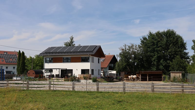 Ein exklusives Anwesen, dass es in dieser Kombination nur selten gibt: Möglichkeiten zur Pferdehaltung direkt am Haus oder großzügiger Gartengestaltung auf 1786 qm sowie ruhiges, erholsames Landleben vereinen sich hier mit modernem, hocheffizientem Wohnen in perfekter infrastruktureller Anbindung. Objektbeschreibung: Das 2021 errichtete KFW 40+ Haus umfasst ca. 220 qm Wohnfläche auf 2 Etagen und bietet freie Entfaltungsmöglichkeiten für Familien. Im EG überzeugt eine Sichtholzdecke, im OG ein offener Sichtdachstuhl, wodurch in den oberen Räumen zusätzlich eine Empore einziehbar wäre. Beide Etagen sowie die kleine Einliegerwohnung sind mit allen Anschlüssen für Küchen sowie mit barrierefreien Bädern und Toiletten ausgestattet. So ergeben sich individuelle Nutzungsmöglichkeiten. Alle baulichen Leistungen wurden durch regionale Handwerksbetriebe durchgeführt, sodass Sie hier hochwertiges, wertstabiles Wohnen und durchdachte Raumaufteilung für Ihren Wohntraum finden werden. Es stehen insgesamt 10 Zimmer in gehobener Ausstattung zur Verfügung. Eine hochwertige Insel-Einbauküche bildet das Herzstück des hellen Wohnzimmers, welches direkten Zugang auf die großzügige Terrasse mit Pergola ermöglicht. Von dort aus genießen Sie den weitläufigen Garten bzw. die Pferdeanlage, wo Sie ihre Tiere direkt vor Ihrem Haus beobachten können. Bei der Errichtung der Pferdeanlage wurde auf leichte Rückbaubarkeit geachtet, sodass die gesamte Fläche auch für andere Wünsche rasch zur Verfügung stehen kann. Ein Hühnerhaltungsareal mit 2 Hühnerställen, rundet den Garten nach Osten hin ab. Vereinbaren Sie jetzt Ihren Besichtigungstermin und kommen Sie ihrem Wohntraum ein Stück näher! Besichtigungsanfragen nehmen wir aus organisatorischen Gründen gerne per Email entgegen. Verfügbar ist das Objekt nach Absprache. Ausstattung Fliesen, Parkettböden, Fußbodenheizung, Barrierefreie Bäder, El. Rollos, Lüftungsanlage mit Wärmerückgewinnung, LAN, Kamin... Lage Kammlach lässt keine Wünsche offen: Sie befinden sich in einer familienfreundlichen Gemeinde im schönen Unterallgäu, wo die Welt noch in Ordnung ist. Der Ort verfügt über Grundschule, Kindergarten, Kita, vielfältiges Sportangebot sowie reichlich Vereinsleben. Ein Supermarkt befindet sich direkt im Ort. Die naturnahe Umgebung mit Wäldern, Rad- und Wanderwegen bietet hohen Freizeit- und Erholungswert. Gleichzeitig erreichen Sie die Kreisstadt Mindelheim in 10 Autominuten, wo Sie alle Annehmlichkeiten der Stadt sowie weiterführende Schulen finden. Verkehrstechnisch besticht Kammlach durch seine Lage und Anbindung: Der Autobahnanschluss A96 ist nur 5 km entfernt. Von dort aus erreichen Sie München in 60 min, Ulm und Augsburg in 50 min. In den Allgäuer Alpen sind sie ebenfalls in ca. 1 Stunde. Sonstiges Für Pferdehalter: Der Reitplatz (ca. 20x20m) ist professionell mit RIDCON- Platten befestigt und besandet, genauso wie die Paddock-Fläche (ca. 20 x 6 m), wo sich ein Offenstall (ca. 3 x 6m) mit Sattelkammer befindet. Zusätzlich gibt es eine von außen befüllbare Raufe. Es besteht eventuell bei Bedarf die Möglichkeit, ca. 1,5 h Koppelfläche in unmittelbarer Umgebung extern dazu zu pachten. Zusätzlich kann die jetzige Heuversorgung und Mistentsorgung weiter genutzt werden. Weitläufiges Ausreitgelände ist verkehrsfrei direkt erreichbar. Im Technikraum befindet sich ein 3-Kammer-Pufferspeicher für Heizung und Warmwasser, welches durch eine Brötje Luftwärmepumpe erwärmt wird. Zusätzlich gibt es eine Wasserenthärtungsanlage sowie einen BYD-Batteriespeicher, der den Strom der PV-Anlage zur Eigennutzung speichert.