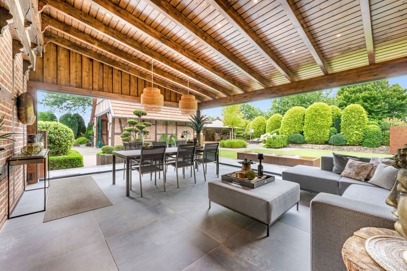 This property was built in 1956 and 1999 on a 8,976 sqm plot of land in a quiet, rural outskirts location with unobstructed views in the district of Teglingen, Meppen. The surroundings offer a pleasant mix of natural living and convenient access to everyday amenities. This spacious rural estate includes two residential buildings on a large parcel of land with versatile options for living, working, and keeping animals. The original house from 1956 was expanded in 1999 with an additional residential building. The combination of traditional construction and modern amenities allows for flexible use and creative design options. In addition to the residential buildings, there are extensive utility areas and well-maintained outdoor facilities. The natural setting provides an unobstructed view of the surrounding fields and combines peaceful living with good accessibility to the district town of Meppen. A photovoltaic system installed in 2004 ensures additional income through full feed-in of electricity. The residence built in 1999 features a spacious and modern layout. On the ground floor, there is an open foyer with a wardrobe area, a bright living/dining room with a tile stove and direct access to the terrace, as well as a large country-style kitchen with a breakfast nook (built-in kitchen included in the purchase price). The stylishly designed summer conservatory, added in 2021, extends the living space and provides a sheltered outdoor retreat. A guest WC completes the room layout on this level. The upper floor offers a large master bedroom with an adjoining walk-in closet, two additional rooms that can be used as children's, work, or guest rooms, and a modern daylight bathroom with two washbasins, a walk-in shower, and built-in cabinets. The partial basement includes a storage room, a fitness room, and the heating room with space for a washing machine and dryer. The original house has been modernized and features a bright, glazed winter garden on the ground floor, harmoniously connecting the living area with the outdoor space. The spacious living and dining room provides ample space for social gatherings, while a separate TV room offers additional retreat options. The modern fitted kitchen from 2016 is included in the purchase price. It is complemented by a utility kitchen with a nostalgic oven, offering extra storage and workspace. The hallway leads to a guest WC with a sink and toilet, as well as a bedroom. A daylight bathroom with a shower, corner bathtub, and washbasin completes the room layout on this floor. Upstairs, there are three additional rooms that can be flexibly used as bedrooms, guest rooms, or offices. The attic is accessible via a pull-down ladder. The partial basement contains a storage room and the heating system. Both houses offer various usage concepts. They are suitable for multi-generational living, as they provide separate living units. The original house, with a bedroom and bathroom on the ground floor, also allows for single-story living. Partial rental is also possible to generate additional income. For horse enthusiasts, the estate offers ideal conditions. The utility building has adaptable stables and storage areas for hay, straw, or other equipment. There is also a dedicated area for horse care, a saddle room, and an enclosed outdoor riding arena with natural footing. The adjoining pasture allows for species-appropriate animal husbandry. The surrounding agricultural fields are currently leased, with the possibility of taking over the lease by arrangement.