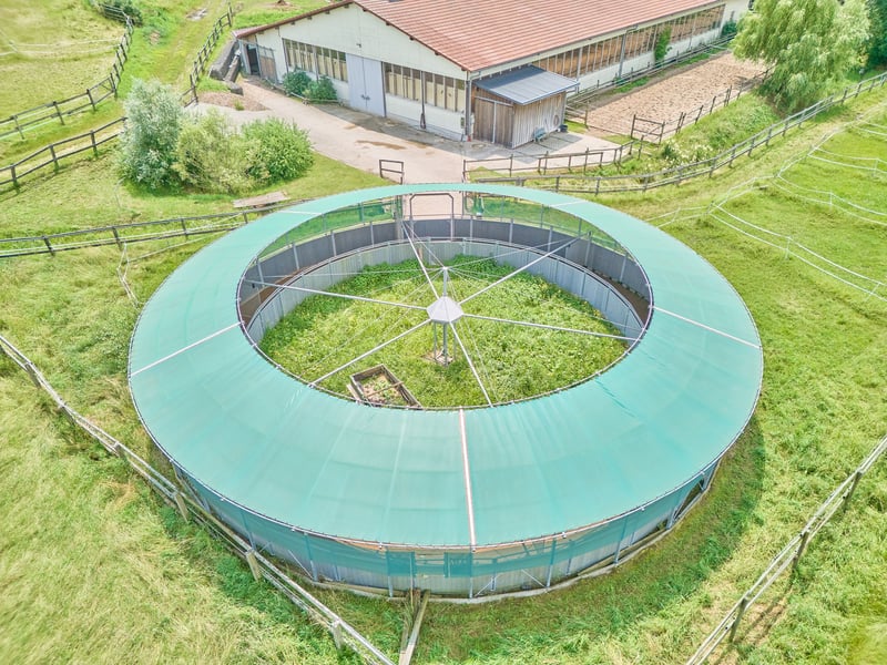 Bitte füllen Sie das nachfolgende Kontaktformular vollständig aus bevor Sie uns telefonisch kontaktieren. Vielen Dank für Ihr Verständnis! Objektbeschreibung: Eine Dressursportanlage, die das Herz höher schlagen lässt – professionelle Infrastruktur trifft historischen Charme und ein außergewöhnlich gepflegtes Ambiente. Wir freuen uns, Ihnen diese hochwertige Reitanlage in Bayern präsentieren zu dürfen, die sowohl sportlich anspruchsvollen Reitern als auch Pferdeliebhabern mit Sinn für historischen Charme gerecht wird. Die Anlage verfügt über eine großzügige Reithalle mit dem Maß 20 × 40 Meter, ausgestattet mit einer modernen Beregnungsanlage, integrierten Lagerflächen, Sitzgelegenheiten und sogar einer Mitarbeiterwohnung. Ergänzt wird das Trainingsangebot durch eine überdachte, matschfrei befestigte Führanlage für sechs Pferde – ideal für ein durchdachtes und schonendes Bewegungsmanagement. Direkt am Hof liegen die Sandpaddocks und Graskoppeln, auf denen die Pferde freie Bewegung genießen können. Auch einen Offenstall mit eigenem Sandpaddock gibt es. Zusätzlich stehen rund 1,8 ha Pachtwiesen zur Verfügung, die ebenfalls unmittelbar an die Anlage angrenzen – ein großer Vorteil in der täglichen Bewirtschaftung. Die Reitanlage bietet Platz für etwa 21 Pferde, verteilt auf zwei Stalltrakte. Der private Bereich mit sieben Boxen und eigener Sattelkammer kann perfekt vom Betriebsbereich mit weiteren vierzehn Boxen getrennt werden. Ein Großteil der Anlage besteht aus großzügigen Paddockboxen, die artgerechte Haltung und Komfort vereinen. Insgesamt umfasst die Hoffläche eine Fläche von 9.796 m²; weitere Flächen sind langfristig angepachtet. Besonderen Charme verleiht dem Anwesen das historische Haupthaus, das umfassend saniert wurde und bei Bedarf in zwei Wohneinheiten teilbar wäre. Ein teilweise unterkellertes Gewölbe sowie der beeindruckende Kreuzgewölbe-Festsaal, der das Wohnhaus mit dem Stallbereich verbindet, schaffen ein einmaliges Ambiente und eröffnen vielseitige Nutzungsmöglichkeiten. Diese Dressursportanlage vereint professionelle Voraussetzungen mit historischem Flair und bietet ideale Bedingungen für ambitionierte Reiter, Trainer, Betriebe oder Pferdeliebhaber. Vereinbaren Sie gerne eine Besichtigung und lassen Sie sich persönlich von der Qualität dieses besonderen Anwesens überzeugen. Ausstattung: Wohnhaus: - Baujahr: 1863/1865 - Wohn- und Nutzfläche: ca. 485,40 m² (10 Zimmer) - Unterteilbar in 2 Wohneinheiten (Küche und Badezimmer auf jeder Etage vorhanden) - Teils unterkellert (Gewölbekeller inkl. Weinkeller) - Brunnenpumpe im Keller, Biokläranlage vorhanden - Speckstein Kaminofen von ca. 2016 im Wohnzimmer - Echtholz-Parkettböden - Fenster: Doppeltverglasung - Deckenhöhe 2,70 m Kreuzgewölbe-Festsaal im Haus, bereits aufwendig saniert, hochwertiger Steinboden, Räumlichkeit verfügt über einen Bullerjan Ofen zur Beheizung (eignet sich ideal als Hofcafé oder Ähnliches, bislang wird es nur als Lagerraum genutzt), bietet die Möglichkeit von hier aus trockenen Fußes in das Stallgebäude zu gehen Reithalle: - Baujahr: 2006 - Reitfläche: 20 x 40 Meter - Boden: Sand/Vließgemisch der Firma Söder - Beregnungsanlage über Brunnenwasser (Filter Rega GmbH) - Voll verglast, Verspiegelung vorhanden - Lagerflächen / Kunden-Apartment im Obergeschoss des Kopfbaus oder auch als Pflegerzimmer mit Dusche und WC nutzbar - Im Erdgeschoss Reiterstübchen oder Mitarbeiter-Apartment (verfügt über Küche, Bad, Schlafzimmer und Wohnbereich) Stallungen: - Privatstall mit 7 Boxen (3 Innenboxen mit Fenster & 4 Paddock-Boxen) mit den Maßen 3,90 x 3 Meter inkl. Waschplatz mit Solarium und privater Sattelkammer (abschließbar) - Einstaller-Stallung: 14 Boxen (8 Innenboxen & 6 Paddock-Boxen) mit den Maßen 3,40 x 3,60 Meter und Paddock 5,50 x 3,40, ebenfalls mit Sattelkammer und Waschplatz und Solarium Scheunengebäude: - Baujahr: 1859 (denkmalgeschützt), bereits saniert - Lagerfläche für Heu & Stroh (ca. 170 Ballen, Lieferant in der Nähe) - Maschinenunterstand - Futterplatz mit Hafersilo Führmaschine: - Baujahr 2016 / 2017 - Durchmesser 20 Meter, für 6 Pferde - Überdachter Hufschlag - Boden: Ridcon Matten mit Hackschnitzel-Untergrund Weiteres: - Genehmigte Mistplatte - Parkplätze und asphaltierte Zufahrt - Hängerparkplatz Lage: Markt Bibart ist ein Markt im Landkreis Neustadt an der Aisch-Bad Windsheim in Mittelfranken und liegt im Steigerwald zwischen Nürnberg und Würzburg an der Bibart. Der Ort gehört dem Verkehrsverbund Großraum Nürnberg an und besitzt einen Bahnhof an der Bahnstrecke Fürth–Würzburg. Er wird stündlich von der Regionalexpresslinie RE 10 (Würzburg–Nürnberg) bedient. Das Umland ist durch mehrere Buslinien erschlossen. Durch Markt Bibart verläuft die Bundesstraße 8. Die B 286 mündet beim Gemeindeteil Enzlar in die B 8. Die Gemeinde gehört zur Verwaltungsgemeinschaft Scheinfeld und hat rund 2.500 Einwohner. In Markt Bibart gibt es eine Grundschule, einen Kindergarten, eine Mittelschule sowie eine Musikschule. Sämtliche Einrichtungen des täglichen Bedarfs (Einkaufsmöglichkeiten, Ärzte, Apotheken, Kindergärten, Grund- und weiterführende Schulen, Banken, sowie Gastronomiebetriebe) sind in Markt Bibart in ausreichendem Maße vorhanden. Markt Bibart bietet seinen Einwohnern fernab der Großstadthektik eine hohe Wohnqualität und viele Freizeitmöglichkeiten. Durch die hervorragende Verkehrsanbindung erreichen Sie sowohl Würzburg, als auch Nürnberg in einer angenehmen Distanz. Die Gemeinde hat sechs Gemeindeteile, dazu gehört auch der Gemeindeteil Enzlar, in dem die Reitanlage Ihren Standort hat. Die hier angebotene Liegenschaft liegt außerhalb des Wohngebietes und verfügt über eine Anbindung an die Bundesstraße, sodass Sie Ihre Einkäufe schnell und unkompliziert erledigen können. Die ländliche Gegend eignet sich nicht nur für Radtouren und Spaziergänge, sondern bietet auch ein abwechslungs