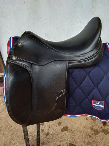 Silla para doma clásica marca Prestige modelo Leonardo, toda de piel genuina en buen estado, muy poco uso, talla 17".
