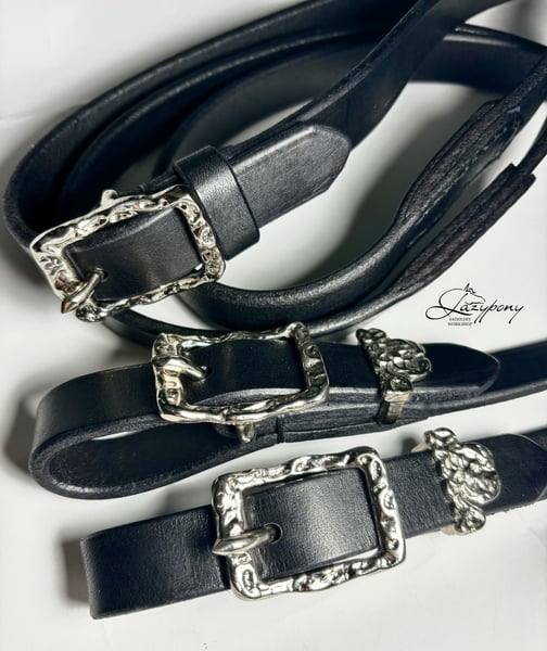 Riendas barroca Lazypony hechas a mano con resistente cuero para talabartería. Estas riendas de cuero liso son ideales para las competiciones, así como para paseos cotidianos y se adaptan a la mayoría de las cabezadas de cuero. Las riendas barroca elegantes están hechas a mano individualmente y hechas con herrajes duraderos. Características: – Fabricado con cuero español para talabartería. – Cosido a mano utilizando técnicas del arte de la talabartería. – Herrajes barroca de gran calidad : elegantes, resistentes y duraderos. – Pintados a mano. – Artesanía española de calidad. Baroque reins Lazypony handmade from durable saddle leather. These plain leather baroque reins are ideal for competitions as well as everyday riding! Soft and durable reins! That stylish reins are individually hand-crafted and made with durable baroque brass hardware. Handcrafted by family workshop Lazypony. A lot of colors!