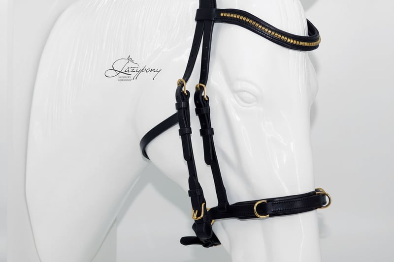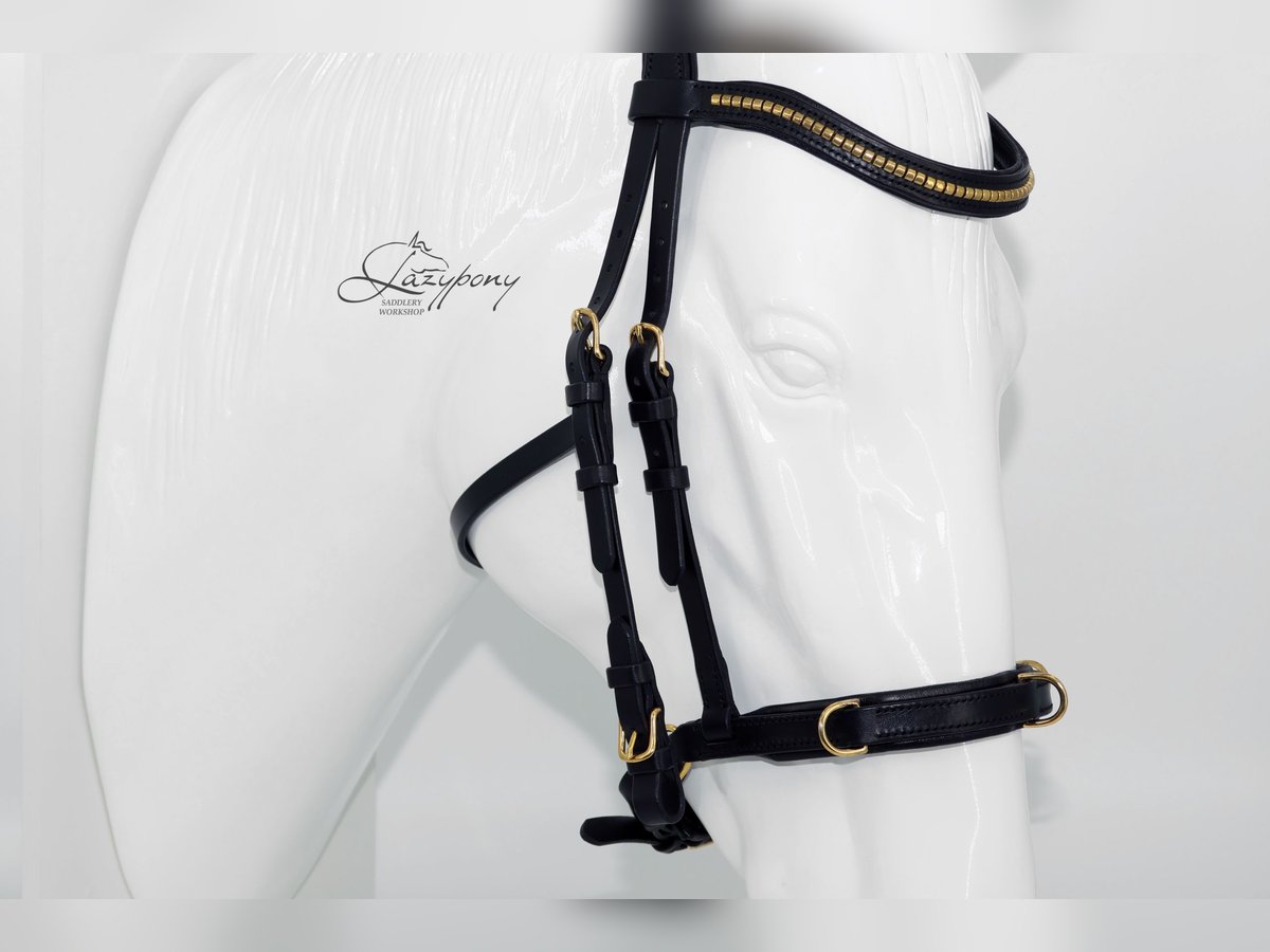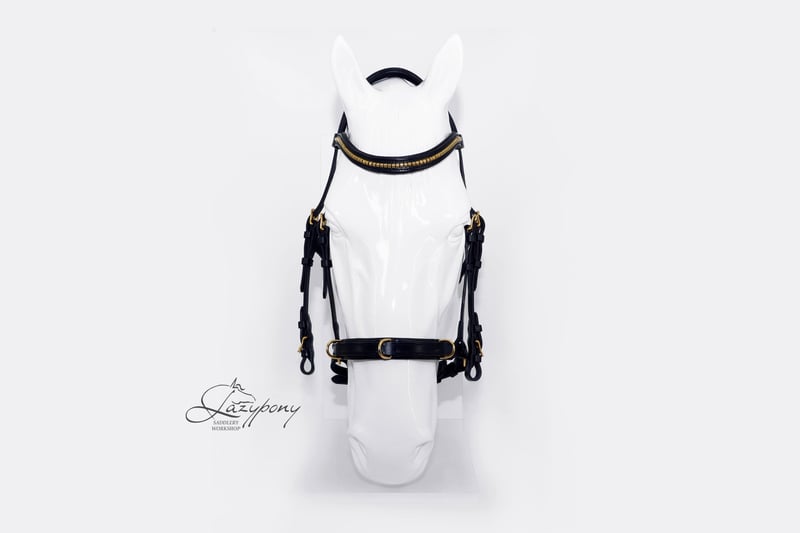 Cabezada cavesson académica Lazypony con cierrabocas con cierre sueco y anillas en D adicionales en la muserola. Esta cabezada tiene muserola acolchada con anillas y es una herramienta perfecta para la transición de con bocado a sin bocado, para usar como cabezada doble (con bocado y sin bocado) con dos pares de riendas y para la equitación académica. También puede utilizarse para trabajar a la cuerda, trabajo a la mano y trabajo desde el suelo. Esta cabezada de cuero hecha a medida cuenta con testera anatómica para permitir el libre movimiento de las orejas. La muserola, la frontalera y la testera tienen acolchado suave para mayor comodidad del caballo. La cabezada incluye ahogadero fijado a las carrilleras para una mejor estabilidad, mayor libertad en la garganta y para evitar que un bocado de palanca empuje las carrilleras hacia los ojos. ¡Una herramienta imprescindible para cualquier entrenador y jinete! La cabezada clincher de cuero hecha a mano Lazypony está fabricada con cuero natural suave y resistente. Utilizamos herrajes de alta calidad y la cosemos cuidadosamente a mano con técnicas tradicionales de guarnicionería: es increíblemente fuerte y duradera. Podemos hacer cualquier talla que necesites: para mini burro, poni o un gran caballo de tiro. ¡Una cabezada fantástica para concursos, entrenamiento y uso diario! Academic cavesson horse bridle Lazypony with crank chin strap and additional d-rings on chin strap. This bridle has padded noseband with rings and it is perfect tool for bit to bitless transition, bit and bitless double bridle with two pair of reins and academic horse riding. You can also use it for lunging, in-hand and ground work. This custom leather horse bridle has anatomical headpiece for free ears movement. Noseband, browband and headpiece have soft padding for extra comfort of your horse. Bridle has throatlash fixed on cheekpieces for better stability of the bridle, freedom of throat and to prevent leverage bit from pushing cheekpieces towards the eyes. Must have tool for every horse trainer and rider! Handmade leather clincher bridle Lazypony is made of soft solid natural leather. We use high-quality fittings and carefully hand-stitch it using traditional saddlery techniques – it is incredibly strong and durable. We can make any size you need – for mini donkey, pony or huge draft horse. Awesome bridle for shows, horse training and daily horse riding!
