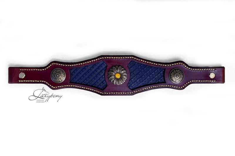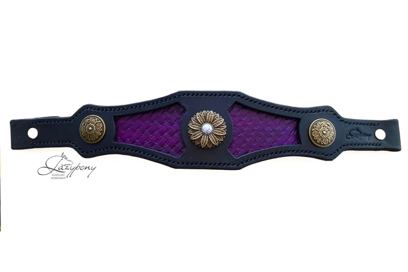 Elegante muserola reemplazable Lazypony hecha a mano para cabezadas de cuadra. Confeccionado en dos capas de suave cuero natural con colorida nappa de por medio y elegantes conchos. La muserola para caballos está cuidadosamente cosida a mano utilizando técnicas tradicionales de talabartería para mayor durabilidad y belleza. ¡Puedes elegir tu combinación de colores favorita! ¡Este artículo único te destacará entre la multitud tanto en casa como en espectáculos! Beneficios: – Fabricada en cuero genuino española de primera calidad; – Cosido a mano utilizando técnicas tradicionales de talabartería; – Herrajes de latón/acero inoxidable de alta calidad: elegantes, resistentes y duraderos; – Pintado a mano. ¡Cada artículo es único! – Hecho a mano en España! Fancy handmade replaceable noseband Lazypony for halters. Made of two layers of soft natural leather with colourful napa in between and elegant conchos. The noseband carefully hand-stitched using traditional saddlery techniques for durability and beauty. You can choose your favourite color scheme! This unique item will stand you up from the crowd both at home and shows! Benefits: – Made of top-quality Spanish genuine leather; – Hand stitched using traditional saddlery techniques. Durable and long-lasting; – Hand painted in rich colours. Each item is unique! – Quality handcrafted in Spain.