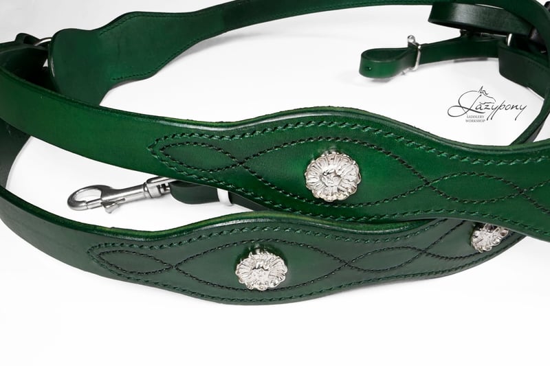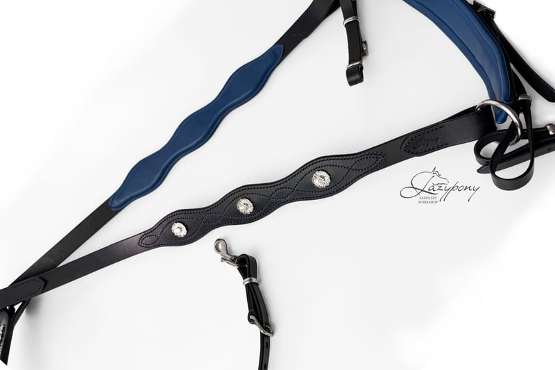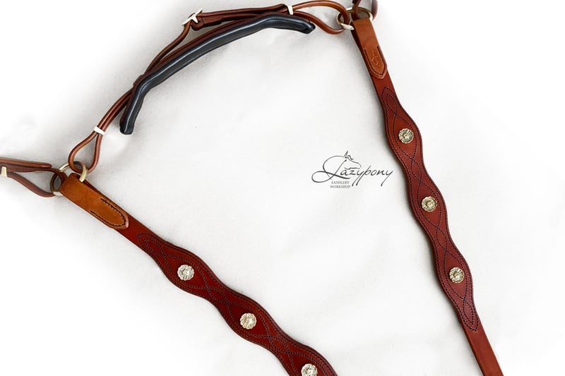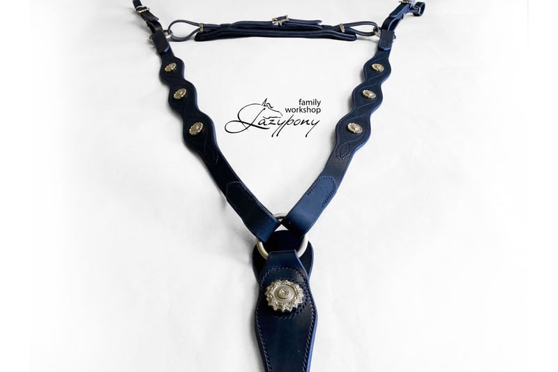 Pechopetral portuguesa Lazypony hecho a mano. Fabricada en cuero auténtica española, suave y duradera, y cosida a mano. El pechopetral tiene forma de Y anatómica y un acolchado suave. El pechopetral portugués Lazypony está adornado con rosetas portuguesas hechas a mano y bordados hechos a mano. La correa encima de la cruz es ajustable y tiene un acolchado suave. Se puede quitar si es necesario. El diseño clásico quedará genial tanto en casa como en el espectáculo. Beneficios: – Fabricada en cuero genuino española de primera calidad. – Cosido a mano utilizando técnicas tradicionales de talabartería. – Herrajes de latón/acero inoxidable de alta calidad: elegantes, resistentes y duraderos. – Pintado a mano. ¡Cada artículo es único! – Hecho a mano en España! Handmade Portuguese Breastplate Lazypony. Made from soft and durable Spanish saddle leather and hand-stitched. The breastplate has an anatomical Y-shape and has soft padding. The soft Portuguese Breastplate Lazypony is embellished with handmade brass Portuguese rosettes and handmade embroidery. The strap above the withers is adjustable and has a soft padding. It can be removed if necessary. The classical design will look great both at home and on the show. Any size you need! A lot of colors! Características: – Fabricado con cuero español para talabartería – Herrajes de gran calidad en latón: elegantes, resistentes y duraderos. – Cosido a mano utilizando técnicas del arte de la talabartería. – Pintados a mano. ¡Cado pechopetral es único! – Artesanía española de calidad. Elija los colores que desee!