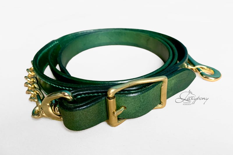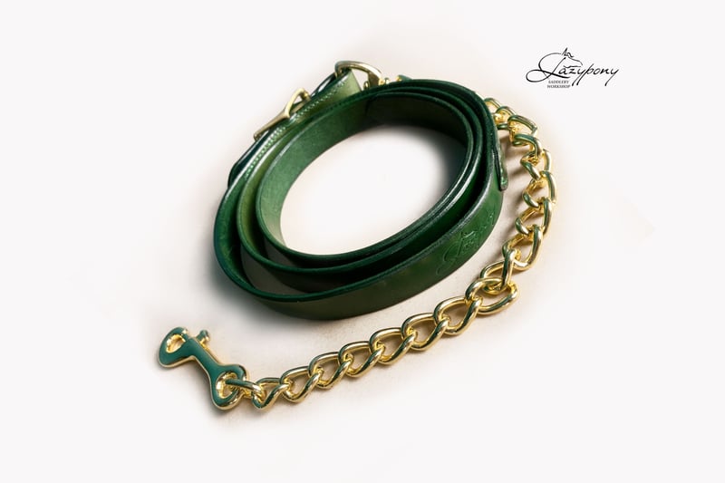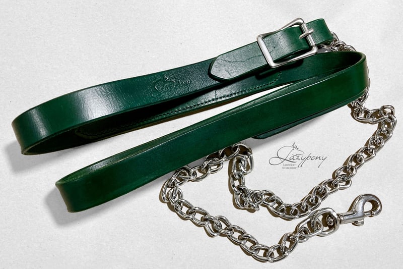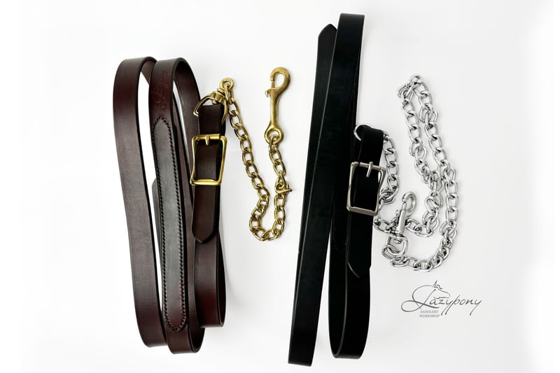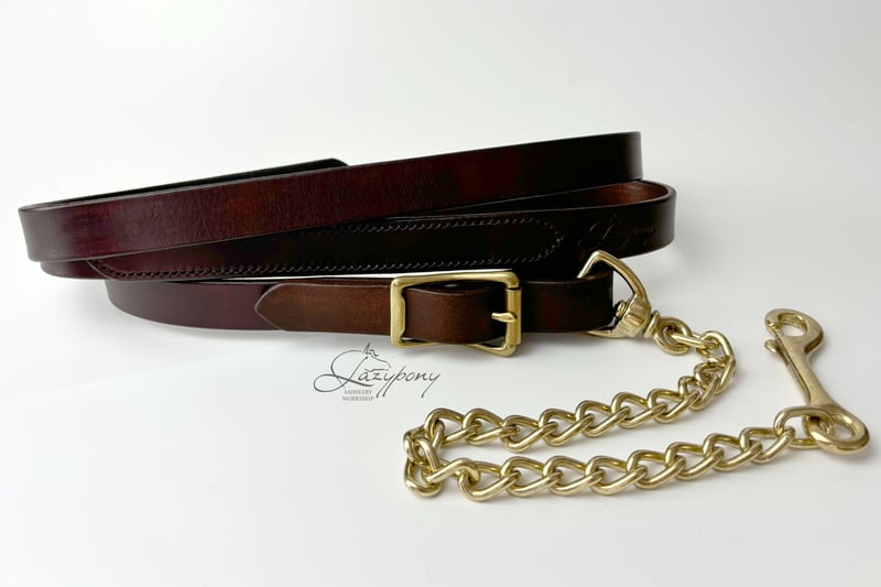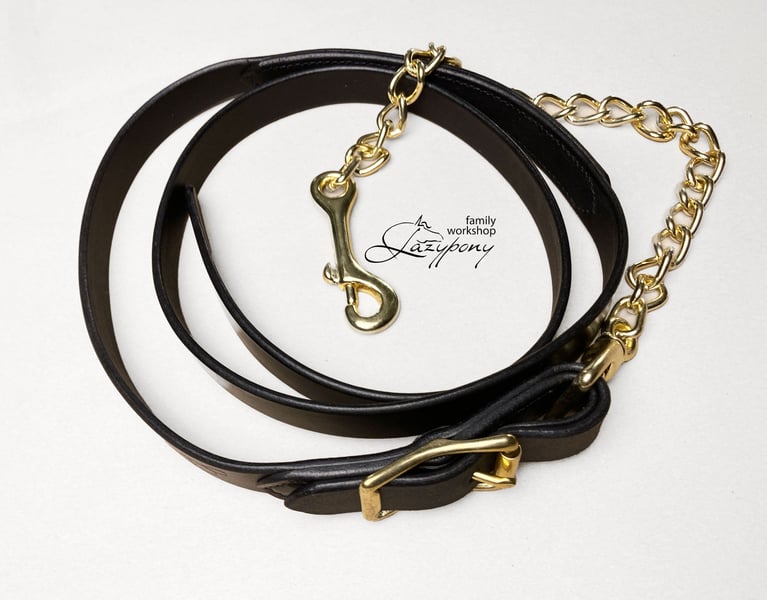 Ramal Lazypony clásico de cuero con cadena. Está fabricado con cuero genuino suave y duradero de primera calidad y cuidadosamente cosido a mano utilizando técnicas tradicionales de talabartería. Este ramal para caballos es perfecta para utilizarla en diferentes eventos como sesiones de fotos, ferias locales y ring de espectáculos profesionales. La longitud es de 1,5 m. El ancho es de 2,5 cm. Se puede cambiar a pedido. Classic leather lead rope with chain made by Lazypony workshop. It manufactured of top-quality durable and soft genuine leather and carefully hand-stitched using traditional saddlery techniques. This lead rope for horses is perfect to use different events such as photo sessions, local fairs and professional show ring. Length is 1,5m. Width is 2,5cm. Can be changed by request.