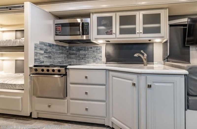 Luxus-Wohnwagen Fleetwood Discovery Flair 34 Klasse A Insgesamt 8 Schlafplätze, inklusive Doppelbett Küche Badezimmer King-Size-Bett Großer Slide-Out Anhängerkupplung 3,5 t Motor: 7,3 l V8 Ford-Motor Automatikgetriebe Länge: 10,50 m Mit deutscher Zulassung