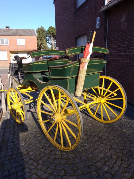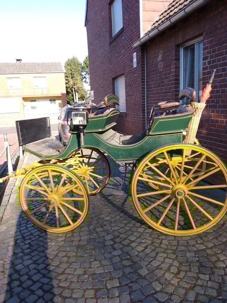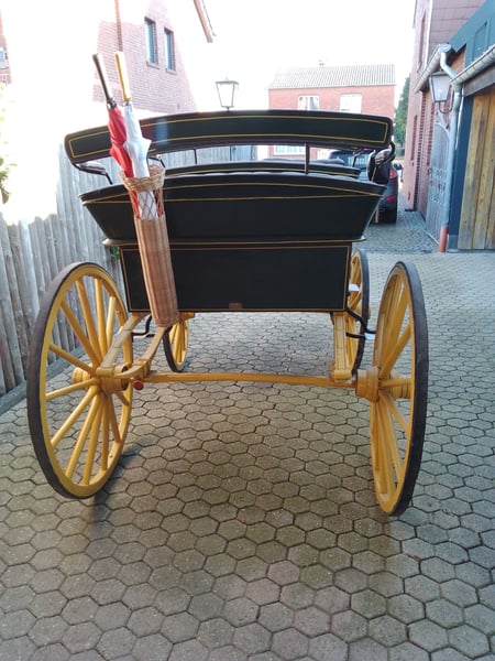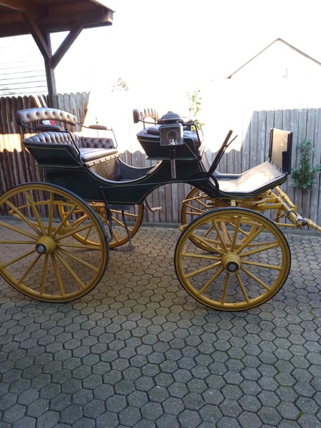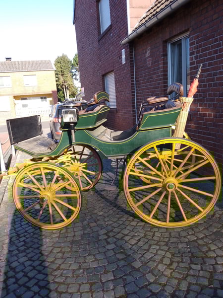 Zum Verkauf steht ein seltener und hervorragend erhaltener Original siamesischer Jagdphaeton der traditionsreichen Wagenfabrik G.H.W. Trimpler aus Lüneburg. Diese Kutsche aus der Zeit um 1920 ist ein Musterbeispiel für handwerkliche Präzision und klassisches Design. Optik & Zustand: Der Phaeton besticht durch seine charakteristische Farbkombination: Ein dunkelgrüner Aufbau auf einem kontrastreichen, gelben Fahrgestell. Die Kutsche befindet sich in einem sehr guten Zustand mit nur minimalen, authentischen Gebrauchsspuren und wurde bis zuletzt regelmäßig für Ausflugsfahrten genutzt. Technische Daten: • Hersteller: G.H.W. Trimpler, Wagenfabrik Lüneburg • Baujahr: ca. 1920 • Räder: Original Holzräder mit Vollgummibezug (vorne 0,98 m / hinten 1,13 m Durchmesser) • Spurbreite: 1,40 m (sorgt für eine sehr stabile Straßenlage) • Bockhöhe: 1,45 m Ausstattung: • Exklusives Interieur: Die Sitze sind mit feinstem, braunem Echtleder in klassischer englischer Heftpolsterung bezogen. • Fahrkomfort: Ein leichtgängiger, wendiger Wagen, der sowohl optisch als auch technisch überzeugt. Dieser Jagdphaeton ist ideal für Traditionsfahrer, die ein stilvolles Fahrzeug für Ausfahrten oder Turniere im Bereich "Traditionelles Anspannen" suchen. Ein fahrbereites Sammlerstück mit historischem Charme. Besichtigung und Abholung nach Vereinbarung.