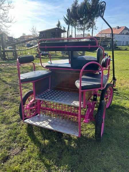 Wir bieten eine sehr gepflegte und voll funktionstüchtige Kutsche inkl. Zubehör an. Einspänner/ Zweispänner Einmal komplettes Geschirr für Pony Holzpaneele sehr gut erhalten, kein aufquellen da sie nur trocken stand. Die Polsterung ist unbeschädigt und nicht durchgesessen. Spurbreite: 127cm Bockhöhe: 110cm
