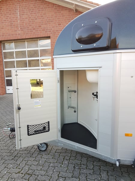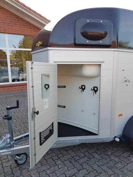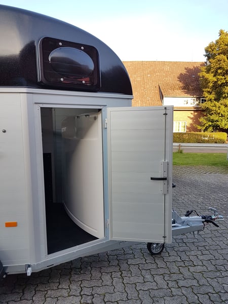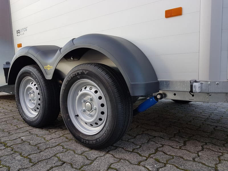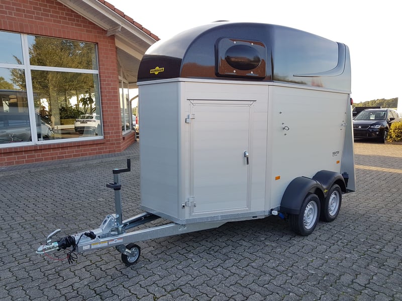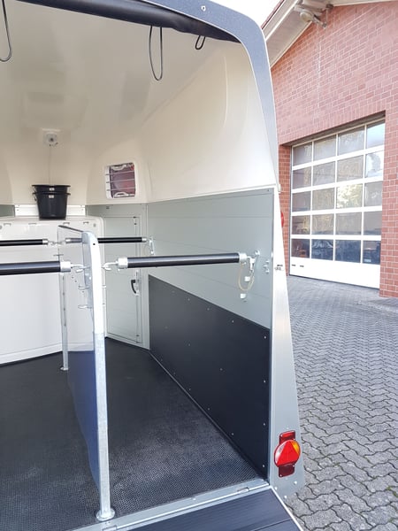 Humbaur Equitos Alu Plus Black 2000 Horse Trailer Car Trailer Age: New (Year of Manufacture: 2025) 2 years of main inspection from the date of first registration Including registration documents (vehicle registration document / registration certificate part 2 and COC) Available from: Immediately (in stock)! Financing through our partner banks possible! Technical Data Permissible total weight: 2,000kg Empty weight: approx. 773kg Payload: approx. 1,227kg Number of axles: 2 Loading area length: 3,157mm Loading area width: 1,654mm Loading area height: 2,300mm Brake type: Braked, overrun brake Chassis: Low loader (wheels beside the body), rubber suspension axles Electrical system: 12V, 13-pin connector Tire size: 175/70 R13 Special Equipment None Standard Equipment EquiDrive® chassis including wheel shock absorbers (100 km/h approval) Alu-BiComp floor 21mm (no wood - rot-proof) Rubber floor 8mm thick Side step protection Body made of double-walled, anodized aluminum profiles Lockable saddle chamber with saddle holder, bridle holder, mirror, and net Rear support with lighting Entrance door with 3-point locking Overrun flap with tread strip rubber Split and height-adjustable breast and rear bars with panic release EquiLock® lockable partition wall Tinted opening windows in poly hood Poly hood in Black Metallic Interior lighting Hay net ring Windbreak Automatic support wheel Frame galvanized V-drawbar AL-KO or Knott axles and brake system Accessories (additional charge) Aluminum rims Silver / Black Saddle rack for 2 saddles (outside) Swiveling saddle rack for 1 saddle (outside) Roof window Foal grille Rear door rotatable and swiveling Continuous box bar for foal transport Step protection rubber for saddle chamber Side padding left and right Head partition wall for middle partition Tarpaulin roll PVC instead of windbreak Wear mat front Wear mat rear Trailer lock Spare wheel 175/70 R13 including spare wheel holder Vehicle delivery nationwide Registration nationwide Transfer license plate (valid for 5 days) Note Weight specifications may vary depending on equipment; errors, intermediate sales, and changes reserved!