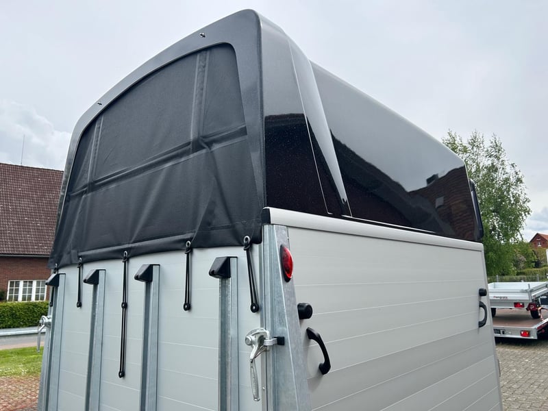 Humbaur Xanthos Aero 2400 Pferdeanhänger PKW Anhänger Alter: Neu (Produktionsjahr: 2025) 2 Jahre Hauptuntersuchung ab dem Tag der Erstzulassung Inkl. Zulassungspapiere (Kfz-Brief / Zulassungsbescheinigung Teil 2 und COC) Verfügbar ab: Ca. 6 Wochen nach Bestelleingang (unverbindlich) Finanzierung über unsere Partnerbanken möglich! Technische Daten Zulässiges Gesamtgewicht: 2.400kg Leergewicht: ca. 855kg Nutzlast: ca. 1.545kg Achsenanzahl: 2 Laderaumlänge: 3.447mm Laderaumbreite: 1.714mm Laderaumhöhe: 2.364mm Bremsenart: Gebremst, Auflaufbremse Fahrgestell: Tieflader (Räder neben Aufbau), Gummifederachsen Elektrik: 12V, 13 poliger Stecker Reifengröße: 195/65 R15 Sonderausstattung Seitenpolsterung links und rechts Abschließbare Sattelkammer mit ausziehbarem Sattelhalter, Trensenhalter, Spiegel, Netz, Innenbeleuchtung, Schaufel und Besen Serienausstattung EquiDrive® Fahrwerk inkl. Radstoßdämpfer (100 km/h-Zulassung) Alu-BiComp-Boden 21mm (kein Holz - unverrottbar) Gummiboden 8mm stark Seitentrittschutz Aufbau aus doppelwandigen, eloxierten Aluminiumprofilen Aerodynamischer Poly-Bug Heckabstützung mit Beleuchtung Einstiegstür mit 3-Punkt-Verriegelung Auflaufklappe mit Trittleistengummi Geteilte und höhenverstellbare Brust- und Heckstangen mit EquiGuard® Panikentriegelung EquiLock® verriegelbare Trennwand Getönte Ausstellfenster in Polyhaube Polyhaube und Bug in Black Metallic Innenbeleuchtung Heunetzring Windschott Automatisches Stützrad Rahmen verzinkt V-Deichsel AL-KO oder Knott Achsen und Bremsanlage Zubehör (aufpreispflichtig) Alufelgen Silver / Black Sattelablagestange für 2 Sättel (außen) Schwenkbare Sattelablage für 1 Sattel (außen) Dachfenster Fohlengitter Hecktür dreh- und schwenkbar Durchgehende Boxenstange zum Fohlentransport Trittschutzgummi für Sattelkammer Seitenpolsterung links und rechts Kopftrennwand für Mitteltrennwand Trennwand mit Holzplatte Abschließbare Sattelkammer mit ausziehbarem Sattelhalter, Trensenhalter, Spiegel, Netz, Innenbeleuchtung, Schaufel und Besen Ohne abschließbare Sattelkammer Sattelkammer Western mit Sattel-, Steigbügel- und Trensenhalter Planenrollo PVC anstatt Windschott Polyhaube in Farbe GFK-Dachheckklappe in Farbe Verschleißmatte vorne Verschleißmatte hinten Abdichtung Heckklappe gemäß EC Nr. 1/2005 Konturmarkierung Pferdeanhänger umlaufend auf Heckklappe Anhängerschloss Reserverad 195/65 R15 inkl. Reserveradhalter Fahrzeuganlieferung deutschlandweit Zulassung deutschlandweit Überführungskennzeichen (5 Tage gültig) Hinweis Gewichtsangaben können je nach Ausstattung abweichen; Irrtümer, Zwischenverkauf und Änderungen vorbehalten!