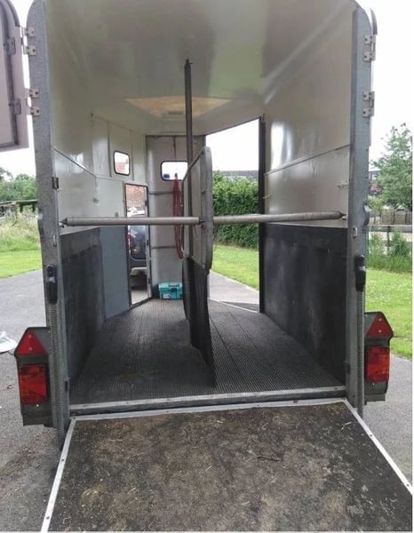 Ifor Williams HB 506 année 2014 PTAC : 2600 kg (détarable jusqu’à 1400 kg); Poids à vide : 820 kg;; Séparation de tête, rail à foin, pont avant, pont porte arrière; Plancher ALUMINIUM