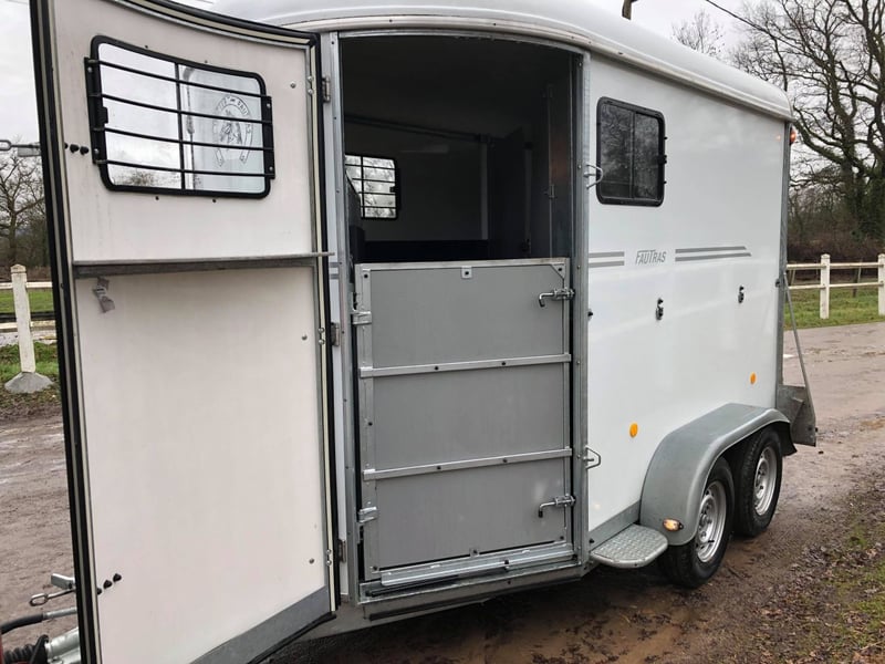 VAN FAUTRAS OBLIC + 2 CHEVAUX COULEUR BLANC GLACIER ANNEE 2010. PLANCHER IMPUTRESCIBLE EN POLYÉTHYLÈNE GARANTIS A VIE; GRANDE SELLERIE AVANT; ÉQUIPÉE 3 BAIES COULISSANTES AVEC GRILLES DE PROTECTIONS; PORTE AMÉRICAINES AVEC VOLETS SUR GLISSIÈRES 3 POSITIONS; ECLAIRAGE INTÉRIEUR; ANTIVOL; ATTELAGE BAT FLANC FAUTRAS; TECH RÉGLABLES; GRANDE SORTIE AVANT AVEC PORTILLON; ROUE DE SECOURS + HOUSSE DE PROTECTION; ROUE JOCKEY RENFORCÉE.