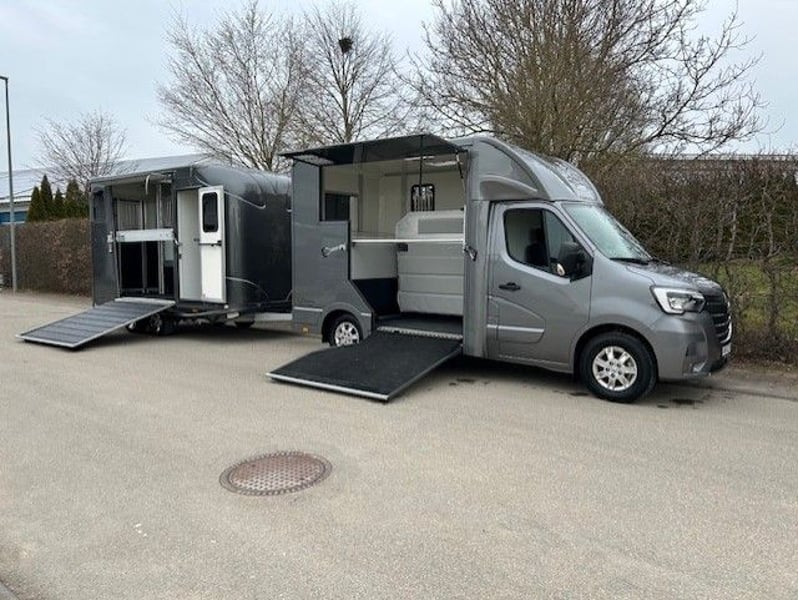 Pferdetransporter Gespann mit B/E Führerschein Mit B/E Führerschein und 4 Pferden unterwegs! Renault Master, Eigengewicht, 2.300 KG, 165 PS, Klima, 3 Sitzer, Doppel-Airbag, großes Display mit Navi, Spiegel, Fenster elektrisch, 59.900,- Euro zzgl. 19% Mwst. Klimatisierung Pferdebereich gegen Aufpreis möglich; Anhänger in Hengstausstattung, Lackierung in DB Mountaingrey-Metallic, große begehbare Sattelkammer, Klappliege, 2 x Deckenablage, Sattel- und Trensenhalter, Ersatzrad, Alufelgen, 18.900,- Euro zzgl. Mwst. Nettopreis 78.800€ zuzüglich 19% Mehrwertsteuer Bruttopreis 93.772 € Verkauf auch einzeln möglich Sofort Verfügbar Besichtigung nur nach Terminabsprache möglich Anfragen unter 01606106131--+491606106131