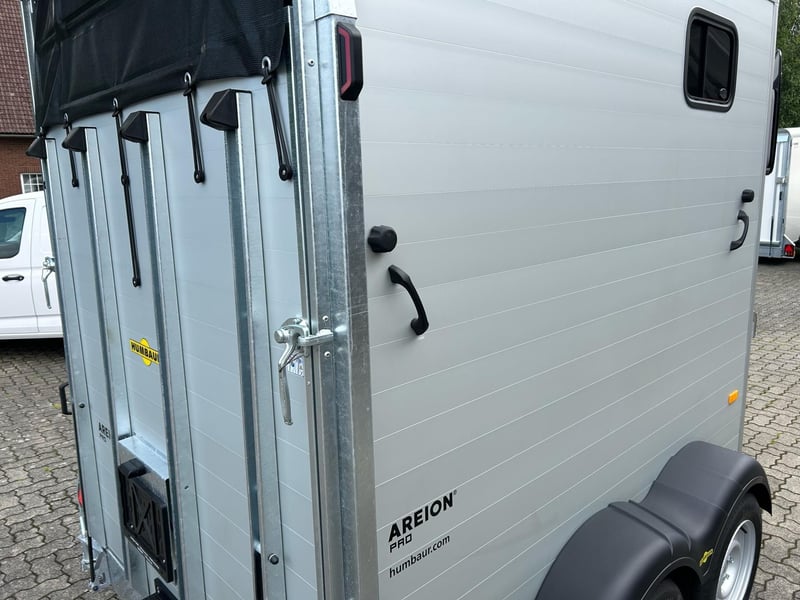 Humbaur Areion Pro 2700 Pferdeanhänger PKW Anhänger Alter: Neu (Produktionsjahr: 2025) 2 Jahre Hauptuntersuchung ab dem Tag der Erstzulassung Inkl. Zulassungspapiere (Kfz-Brief / Zulassungsbescheinigung Teil 2 und COC) Verfügbar ab: Sofort (auf Lager)! Finanzierung über unsere Partnerbanken möglich! Technische Daten Zulässiges Gesamtgewicht: 2.700kg Leergewicht: ca. 1.049kg Nutzlast: ca. 1.651kg Achsenanzahl: 2 Laderaumlänge: 3.538mm Laderaumbreite: 1.703mm Laderaumhöhe: 2.400mm Bremsenart: Gebremst, Auflaufbremse Fahrgestell: Tieflader (Räder neben Aufbau), Gummifederachsen Elektrik: 12V, 13 poliger Stecker Reifengröße: 195/65 R15 Sonderausstattung Ohne Serienausstattung Hecktüre dreh- und schwenkbar Abschließbare Sattelkammer mit ausziehbarem Sattelhalter, Trensenhalter, Spiegel, Netz, Innenbeleuchtung, Schaufel und Besen Seitenpolsterung links und rechts Verschleißmatte vorne EquiDrive® Fahrwerk inkl. Radstoßdämpfer (100 km/h-Zulassung) Alu-BiComp-Boden 21mm (kein Holz - unverrottbar) Gummiboden 8mm stark Seitentrittschutz Aufbau aus doppelwandigen, eloxierten Aluminiumprofilen Poly-Bug im aerodynimschen Rippendesign LED-Beleuchtung Mannshohe Einstiegstür mit 3-Punkt-Verriegelung Extralange Auflaufklappe mit Trittleistengummi Geteilte und höhenverstellbare Brust- und Heckstangen mit EquiGuard® Panikentriegelung EquiLock® verriegelbare Trennwand Getönte Ausstellfenster in Seitenwänden Seitenschiebefenster Polyhaube und Bug in Black Metallic LED-Streifen-Innenbeleuchtung Verstellbare Heunetzhalter Windschott Automatisches Stützrad Rahmen verzinkt V-Deichsel AL-KO oder Knott Achsen und Bremsanlage Zubehör (aufpreispflichtig) Alufelgen Silver / Black Sattelablagestange für 2 Sättel (außen) Schwenkbare Sattelablage für 1 Sattel (außen) Dachfenster Fohlengitter Durchgehende Boxenstange zum Fohlentransport Trittschutzgummi für Sattelkammer Klebedekor (Verschiedene Motive) Kopftrennwand für Mitteltrennwand Sattelkammer mit ausziehbarem Sattelhalter Western mit Sattelhalter, Trensenhalter, Spiegel, Netz, Innenbeleuchtung, Schaufel und Besen Planenrollo PVC anstatt Windschott (Schwarz oder Silber) Polyhaube und Bug in Farbe Verschleißmatte vorne Verschleißmatte hinten Konturmarkierung Areion Anhängerschloss Reserverad 195/65 R15 inkl. Reserveradhalter Fahrzeuganlieferung deutschlandweit Zulassung deutschlandweit Überführungskennzeichen (5 Tage gültig) Hinweis Gewichtsangaben können je nach Ausstattung abweichen; Irrtümer, Zwischenverkauf und Änderungen vorbehalten!