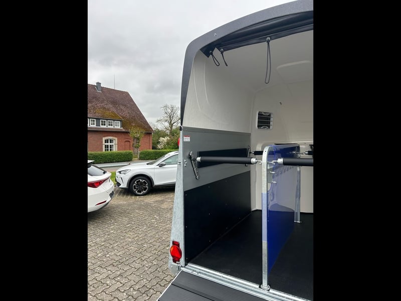 Humbaur Pegasus 2400 Pferdeanhänger PKW Anhänger Alter: Neu (Produktionsjahr: 2025) 2 Jahre Hauptuntersuchung ab dem Tag der Erstzulassung Inkl. Zulassungspapiere (Kfz-Brief / Zulassungsbescheinigung Teil 2 und COC) Verfügbar ab: Sofort (auf Lager)! Finanzierung über unsere Partnerbanken möglich! Technische Daten Zulässiges Gesamtgewicht: 2.400kg Leergewicht: ca. 910kg Nutzlast: ca. 1.490kg Achsenanzahl: 2 Laderaumlänge: 3.460mm Laderaumbreite: 1.710mm Laderaumhöhe: 2.370mm Bremsenart: Gebremst, Auflaufbremse Fahrgestell: Tieflader (Räder neben Aufbau), Gummifederachsen Elektrik: 12V, 13 poliger Stecker Reifengröße: 195/65 R15 Sonderausstattung Seitenpolsterung links und rechts Hecktür dreh- und schwenkbar Serienausstattung EquiDrive® Fahrwerk inkl. Radstoßdämpfer (100 km/h-Zulassung) Alu-BiComp-Boden 21mm (kein Holz - unverrottbar) Gummiboden 8mm stark Seitentrittschutz Aufbau aus doppelwandigen, eloxierten Aluminiumprofilen Aerodynamischer Poly-Aluaufbau Abschließbare Sattelkammer mit ausziehbarem Sattelhalter, Trensenhalter, Spiegel, Netz, Innenbeleuchtung, Schaufel und Besen Heckabstützung mit Beleuchtung Mannshohe Einstiegstür mit 3-Punkt-Verriegelung Auflaufklappe mit Trittleistengummi Geteilte und höhenverstellbare Brust- und Heckstangen mit EquiGuard® Panikentriegelung EquiLock® verriegelbare Trennwand Getönte Ausstellfenster in Polyhaube Polyhaube und Bug in Black Metallic Innenbeleuchtung Heunetzring Windschott Automatisches Stützrad Rahmen verzinkt V-Deichsel AL-KO oder Knott Achsen und Bremsanlage Zubehör (aufpreispflichtig) Alufelgen Silver / Black Sattelablagestange für 2 Sättel (außen) Schwenkbare Sattelablage für 1 Sattel (außen) Dachfenster Fohlengitter Hecktür dreh- und schwenkbar Durchgehende Boxenstange zum Fohlentransport Trittschutzgummi für Sattelkammer Sattelhalter ausziehbar Western Seitenpolsterung links und rechts Kopftrennwand für Mitteltrennwand Trennwand mit Holzplatte Planenrollo PVC anstatt Windschott Polyhaube in Farbe Verschleißmatte vorne Verschleißmatte hinten Abdichtung Heckklappe gemäß EC Nr. 1/2005 Konturmarkierung Pferdeanhänger umlaufend auf Heckklappe Panoramafenster Anhängerschloss Reserverad 195/65 R15 inkl. Reserveradhalter Fahrzeuganlieferung deutschlandweit Zulassung deutschlandweit Überführungskennzeichen (5 Tage gültig) Hinweis Gewichtsangaben können je nach Ausstattung abweichen; Irrtümer, Zwischenverkauf und Änderungen vorbehalten!