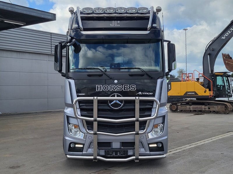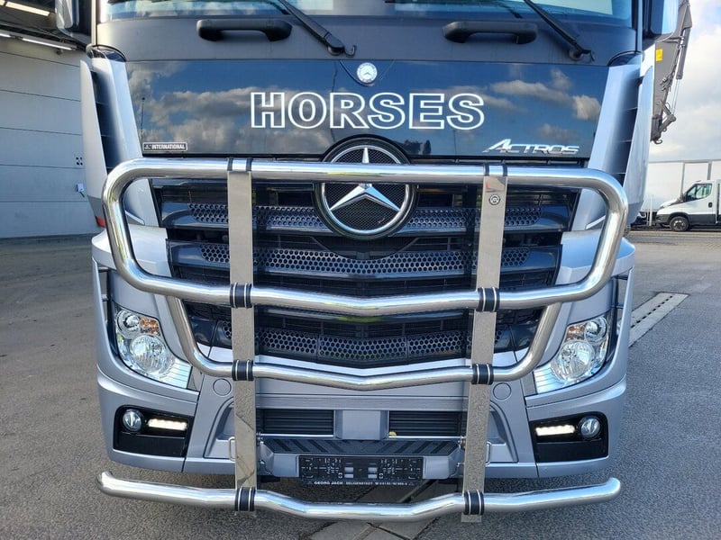 Mercedes-Benz Actros 2551 Horse Truck + Living (2017, Euro 6) with JL International bodywork, only 23,236 km. Interior designed for 5–6 horses, GigaSpace cab, and 510 hp OM471 engine with 12-speed automatic transmission (6×2, 500 l). Luxurious living area featuring a bathroom, kitchenette (ceramic cooktop with 2 burners), mini fridge, fold-out bed, TV above, household air conditioning, and hot water boiler from Stiebel Eltron; includes PRO ATOR 3500-A winch. Additionally equipped with climate control, parking air conditioning, parking heater, adaptive cruise control, lane departure warning, collision warning, navigation system, and rearview camera. Very well-maintained, ready-to-use horse transporter. Comfort & Safety - Climate control / air conditioning, parking air conditioning, parking heater - Adaptive cruise control, forward collision warning, lane departure warning - Navigation, radio, rearview camera - LED daytime running lights, halogen and cornering lights, fog lights - Leather upholstery, seat heating, air-sprung driver’s seat - Electrically adjustable mirrors, AdBlue system, coupling with rescue hook Highlights - Bathroom - Washbasin - Cabinet with 8 drawers - Ceramic cooktop with 2 burners - Fold-out bed - Mini fridge - TV on the second level - Household air conditioning - Shower-bath with washbasin - Hot water boiler from Stiebel Eltron