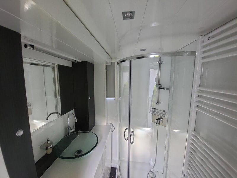 Mercedes-Benz Actros 2551 Pferdetransporter mit Wohnaufbau (2017, Euro 6) von JL International, nur 23.236 km. Aufbau für 5–6 Pferde, GigaSpace-Kabine und 510 PS OM471 mit 12-Gang-Automatik (6×2, 500 l). Luxuriöses Wohnen mit Bad, Küchenzeile (2-Flamm-Keramikkochfeld), Minikühlschrank, Schlafcouch, Fernseher oben, Haushaltsklimaanlage und Warmwasserboiler von Stiebel Eltron; inklusive PRO ATOR 3500-A Seilwinde. Weiterhin mit Klimaautomatik, Standklimaanlage und Standheizung, adaptivem Tempomat, Spur- und Kollisionswarner, Navigationssystem und Rückfahrkamera. Sehr gepflegter, sofort einsatzbereiter Pferdewagen. Komfort & Sicherheit - Klimaautomatik / Klimaanlage, Standklimaanlage, Standheizung - Adaptiver Tempomat, Kollisionswarnung, Spurverlassenswarner - Navigationssystem, Radio, Rückfahrkamera - LED-Tagfahrlicht, Halogen- und Blinklichter, Fernscheinwerfer - Lederpolsterung, Sitzheizung, luftgefederter Fahrersitz - Elektrisch verstellbare Spiegel, AdBlue, Anhängerkupplung Highlights - 1 Badezimmer - 1 Waschbecken - Schrank mit 8 Schubladen - Keramikkochfeld mit 2 Kochstellen - Schlafcouch - Minikühlschrank - Fernseher im Obergeschoss - Haushaltsklimaanlage - Duschbad mit Waschbecken - Warmwasserboiler, Marke: Stiebel Eltron