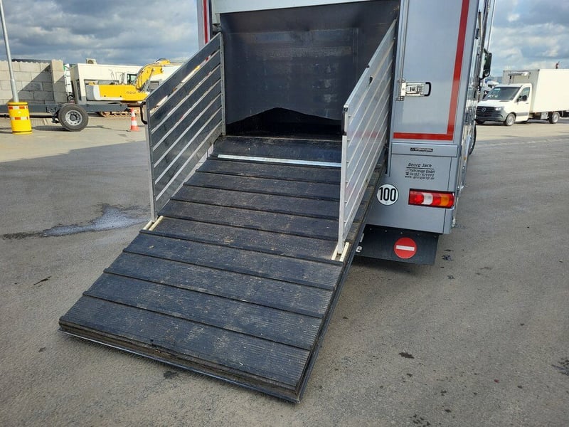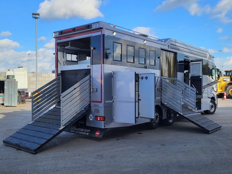 Mercedes-Benz Actros 2551 Horse Truck + Living (2017, Euro 6) with JL International bodywork, only 23,236 km. Interior layout for 5–6 horses, GigaSpace cab, and 510 hp OM471 engine with 12-speed automatic transmission (6×2, 500 liters). Luxurious living area featuring a bathroom, kitchenette (ceramic hob with 2 burners), mini fridge, fold-out bed, TV above, household air conditioning, and a Stiebel Eltron hot water boiler; includes PRO ATOR 3500-A winch. Additionally equipped with climate control, parking air conditioning and heater, adaptive cruise control, lane departure and collision warning systems, navigation, and rearview camera. Very well-maintained, ready-to-use horse transport vehicle. Comfort & Safety - Climate control / air conditioning, parking air conditioning, parking heater - Adaptive cruise control, forward collision warning, lane departure warning - Navigation system, radio, rearview camera - LED daytime running lights, halogen and cornering lights, fog lights - Leather upholstery, seat heating, air-sprung driver’s seat - Electrically adjustable mirrors, AdBlue, gooseneck coupling Highlights - One bathroom - One washbasin - Wardrobe with 8 drawers - Ceramic hob with 2 burners - Fold-out bed - Mini fridge - TV on the second level - Household air conditioning - Shower bath with washbasin - Hot water boiler (Stiebel Eltron)