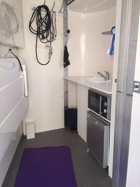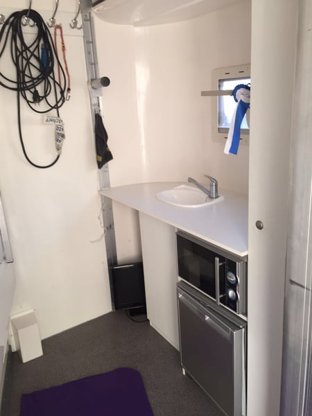 For sale is a well-maintained and practical 3-horse trailer with a comfortable living area – ideal for competitions and longer trips. Living area features: Small kitchenette with sink, refrigerator, and microwave Shower cabin with hot water Seating/sleeping option Shelves, hooks, and storage space for equipment Windows and roof hatch for good ventilation Horse compartment: Space for 3 horses Sturdy floor with rubber mat Saddle and bridle holders Easy cleaning due to robust materials Notes: The competition box is not included in the sale. This trailer combines functionality and comfort for both horse and rider. Perfect for competition riders who value a practical living area. 📍 Viewing available by appointment.