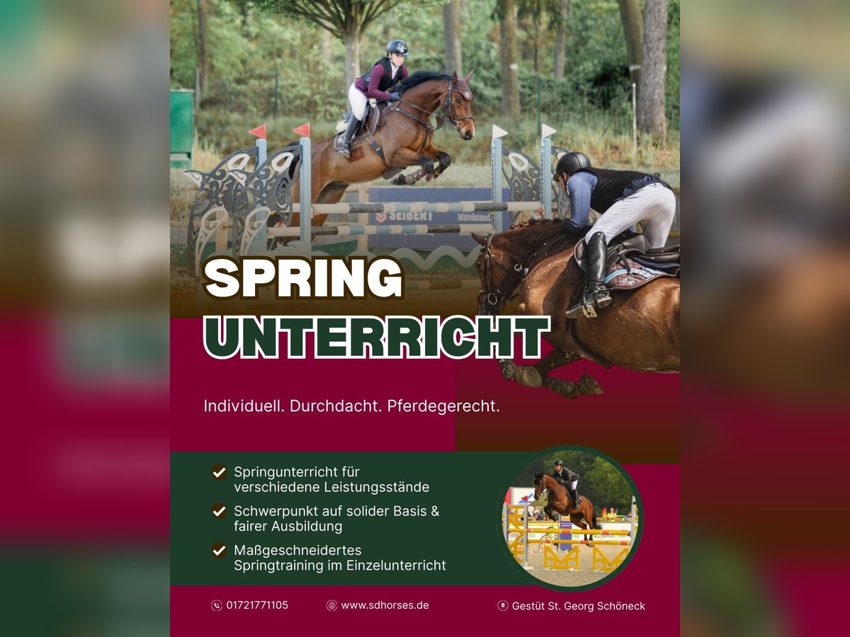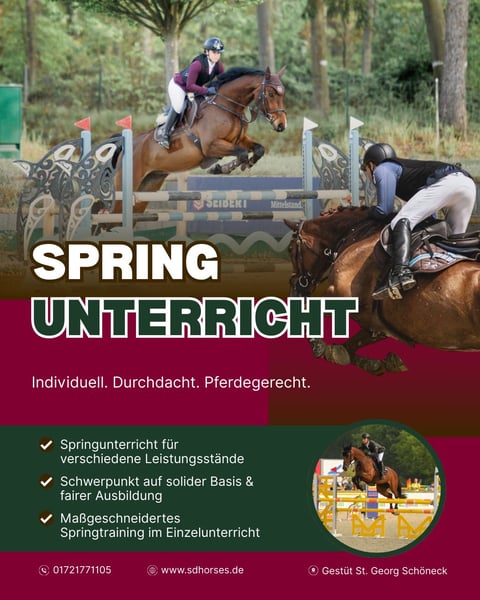 Ab sofort bieten wir qualifizierten Springunterricht für Reiterinnen und Reiter aller Leistungsstufen an. Egal ob Anfänger oder Fortgeschrittene – jeder ist herzlich willkommen. Der Unterricht eignet sich für Jungpferde ebenso wie für erfahrene Pferde und wird individuell auf den Ausbildungsstand von Reiter und Pferd abgestimmt. Inhalte des Trainings können unter anderem sein: * Grundlagen des Springreitens * Springgymnastik zur Verbesserung von Technik und Rhythmus * Parcourspringen und Vorbereitung auf Turniere * Individuelle Förderung von Reiter und Pferd Ziel ist ein ruhiges, sicheres und pferdegerechtes Training mit Spaß und Motivation. Bei Interesse oder Fragen gerne melden – wir freuen uns auf euch!