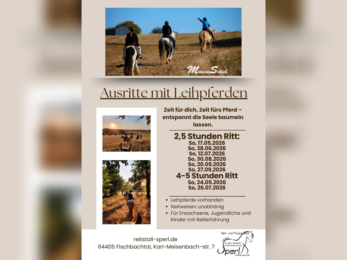 Wanderreiten in einer der schönsten Gegenden des Odenwaldes -Fischbachtal Wünschst du dir eine Auszeit in der Natur im Sattel eines Pferdes, das dich sicher durchs Terrain trägt & dich den Alltag vergessen lässt? Auf unserem Wanderritt kannst du dich auf den Rhythmus des Pferdes und der Natur einlassen und ein wunderschönes Panorama genießen. Ist dies schon länger dein Traum & du hast es einfach immer wieder hinausgezögert? Los geht’s! Wir warten auf dich Gerne erfüllen wir deinen Traum & bieten dir unvergessliche Momente im Westernsattel unserer Pferde, die aufgrund ihrer natürlichen Haltungsform in der Herde, entspannt und zufrieden sind. Mehr Informationen und Termine unter https://www.reitstall-sperl.de/wanderreit-wochenende