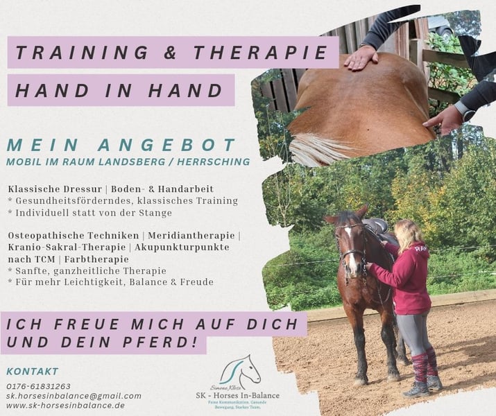 Hallo, ich bin Simone, ich begleite Pferd-Reiter-Paare mit pferdegerechtem Reitunterricht. Mit meiner Ausbildung zur Trainerin, nach dem IN-BALANCE Konzept, ist es mein Ziel, Beweglichkeit, Balance und eine feine Kommunikation zwischen Pferd und Reiter zu fördern. Mein Unterricht richtet sich besonders an: - Freizeitreiter - Spät- und Wiedereinsteiger - Reiter mit Unsicherheiten Viele Reiter wünschen sich im Freizeitbereich keine leistungsorientierte oder starre Dressurarbeit. Entsprechend arbeite ich ruhig, individuell und ohne Leistungsdruck. Der Unterricht versteht sich als gymnastizierende, gesunderhaltende Basisarbeit, angepasst an das jeweilige Pferd und seinen Menschen. Ziel ist eine klare, faire Verständigung zwischen Pferd und Reiter sowie die langfristige Gesunderhaltung des Pferdes. Schwerpunkte: - feine Hilfengebung - ausbalancierter Reitersitz - gymnastizierende Basisarbeit vom Boden und aus dem Sattel - mentale Ausgeglichenheit - ruhiges, pferdegerechtes Training Mobiler Unterricht bei dir am Stall: Raum Landsberg am Lech, Herrsching, Ammersee, Oberbayern Weitere Regionen (bayernweit sowie Raum Osnabrück) nach Absprache Preise Reitunterricht: Einzelunterricht: 60 € (bis 50 km) - ab 50 km zzgl. 0,40 €/km Die erste Reitstunde gilt als Kennenlernstunde und ist 10 € günstiger: Kennenlernstunde: 50 € (bis 50 km) - ab 50 km zzgl. 0,40 €/km