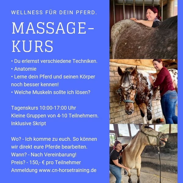 Kursangebot Tageskurs Bewegungsanalyse Du hast Interesse daran einfach mehr über dein Pferd zu erfahren? Du willst das Training mit deinem Pferd optimal gestalten? Kurs bei euch vor Ort mit euren Pferden. Ihr erhaltet Analysebögen. Jedes Pferd wird zusammen analysiert. Was sehen wir? Wo kommt es her? Was kann man verbessern? Was ist schon super? Zusammen erstellen wir Tipps zum Training für jedes Pferd. Anzahl der Teilnehmer 3-6 Preis pro Person 150,- Euro zzgl. Anfahrt. Weitere Angebote: * Osteopathische Behandlung 150,- Euro zzgl. Anfahrt. * Cranio-sacrale-Therapie 70,- Euro zzgl. Anfahrt. * Einzelunterricht Bodenschule/Reitunterricht Pro Einheit circa 45 Minuten auf dem eigenen Pferd berechne ich 45,- Euro zzgl. Anfahrt. * vollständige Analyse inkl. Equipment, Pferd im Stand, Pferd in der Bewegung, an der Longe, unter dem Reiter. Reitunterricht, schriftlicher Trainingsplan. 140,- Euro zzgl. Anfahrt * kurze Sichtung, Kundenerzählung, Trainingsplan 80,- Euro zzgl. Anfahrt * Unterricht, schriftlicher Trainingsplan 95,- Euro zzgl. Anfahrt * tel., Ziele Kd., Fotos Pferd, Trainingsplan 70,- Euro zzgl. Anfahrt * Workshops Es können auch Tageskurse für die Bodenschule, Reiten und vieles mehr für mehrere Teilnehmer am eigenen Reitstall organisiert werden. Gerne komme ich zu Ihnen und Ihrem Pferd, sodass Sie ohne Verladestress trainieren können. Mein Standort ist Bottrop-Kirchhellen. (Unterrichtseinheiten die nicht am Vortag abgesagt wurden, werden entsprechend berechnet.) Osteopathie, Physiotherapie, Horsetraining, Westernreiten, Westerntrainer, Dressurtrainer, TGT Trainer, Reittrainer, Reitlehrer, Pferdegerecht, Pferdefreundlich, Therapeut