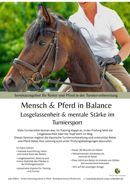 Training klappt – Turnier nicht? Genau dafür habe ich ein Seminar entwickelt, das die klassische Turniervorbereitung ergänzt. Es geht um mentale Klarheit beim Reiter und Losgelassenheit beim Pferd unter Prüfungsbedingungen. Im Fokus stehen: -mentale Stärke, Fokus & innere Ruhe des Reiters -Losgelassenheit, Balance & innere Stabilität des Pferdes -praxisnahe Impulse für Training & Turnieralltag Ort: auf der jeweiligen Anlage Dauer: 90 Minuten Teilnehmer: mind. 6, max. 10 Reiter Preis: 145 € pro Reiter im Umkreis von 100 km um PLZ 49716, bei größerer Entfernung Preis auf Anfrage Interesse? Bitte trage dich unverbindlich ein oder melde dich direkt bei: Julia Wilbers Tierheilpraktikerin | Pferdewirtin Turniervorbereitung für Reiter & Pferd kontakt@tierisch-natur-verbunden.de