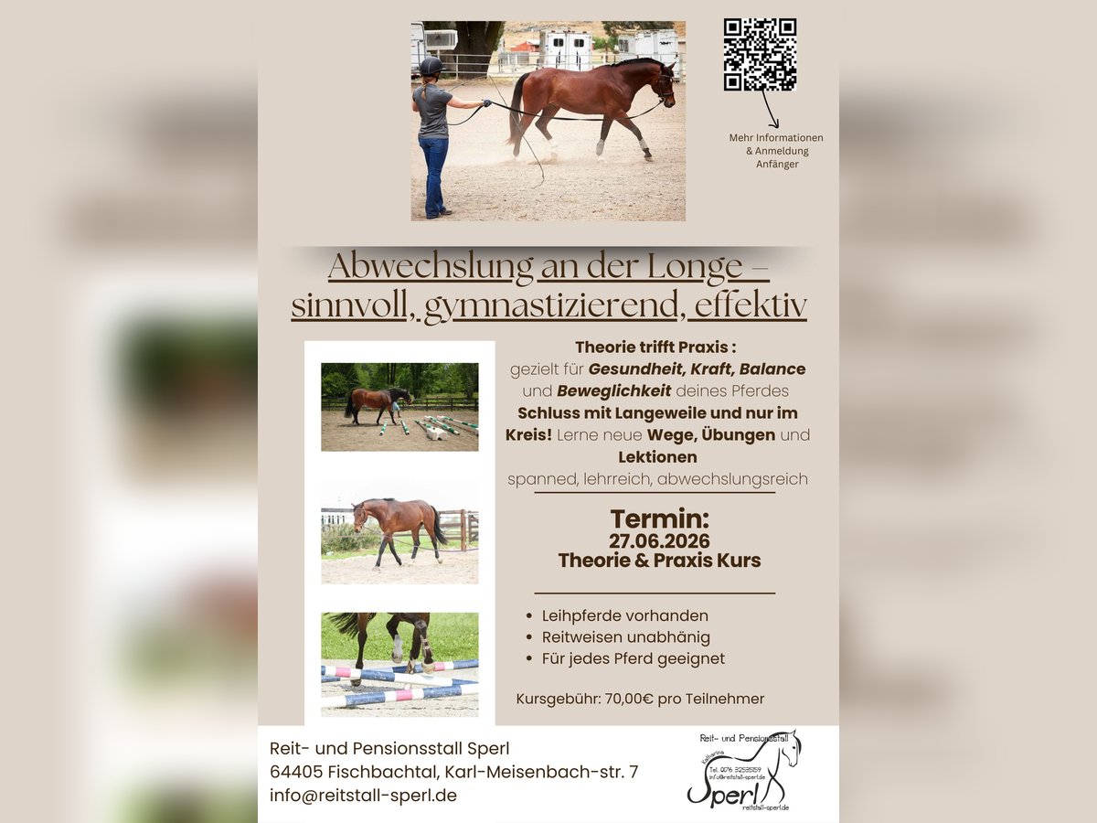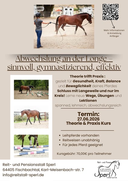 Datum: 27.06.2026 Kursleitung: Sabrina Henderkes und Katharina Sperl Longieren neu gedacht – endlich spannend & abwechslungsreich Buchung und mehr Informationen über das Reitbuch: https://reitstall-sperl.reitbuch.com/course.php?c=83 oder das untenstehehnde Kontaktformular Theorie trifft Praxis – mit zwei Trainern Zu Beginn sammeln wir gemeinsam in der Gruppe gezielt Themen, Fragen und Problemstellungen und Ideen rund ums Longieren. Gemeinsam bauen wir danach in der Reithalle verschiedene Longier-Stationen auf. Im Anschluss werden die großen Zusammenhänge verständlich erklärt: Welche Wirkung haben einzelne Übungen auf den Pferdekörper? Welche Muskelgruppen werden angesprochen und gestärkt? Wie tragen Grundlektionen an der Longe zur langfristigen Gesunderhaltung bei? Wie erkennt und beurteilt man korrekte Bewegungsabläufe? Besonderheit: Zwei Trainer begleiten die Veranstaltung parallel. Ein Trainer demonstriert die Übung praktisch am Pferd, während der zweite Trainer zeitgleich erklärt, was im Körper des Pferdes passiert, woran man gesunde Bewegung erkennt und wie eine korrekte Ausführung beurteilt wird. Themen: Zirkel verkleinern und vergrößern Zirkel verlagern gezielte Mediennutzung mit Stangen und Hütchen verschiedene Handwechsel leichte Seitengänge & Weichen an der Longe Im Anschluss wird in der Praxis gearbeitet - je Gruppe 3 Pferde 45 Minuten