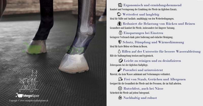 Gummimatten 12 mm & 17 mm für Pferde, Kühe und Schweine – Stallmatten & Stallboden mit Puzzle-System Extra große, robuste und rutschfeste Bodenmatten für Pferdeboxen, Ausläufe, Anhänger und Stallbereiche 🌐 Online-Shop: rasengitter-paddockplatten.de Premium Qualität zum besten Preis ⭐ ⭐ 12 mm: EUR 39,00 netto | EUR 46,41 brutto ⭐ 17 mm: EUR 49,80 netto | EUR 59,26 brutto zzgl. Versand Produktdetails Modell: ReitPRO 12 mm / 17 mm Maße: 1,20 m × 1,80 m = 2,16 m² pro Matte Material: 100 % recycelter, vulkanisierter Vollgummi Verbindung: Puzzle-System – stabil, passgenau und schnell montierbar Oberfläche: rutschfest, strukturiert, ergonomisch Ihre Vorteile – Stallmatten & Pferdematten ✔ Extrem robust und langlebig – ideal für Pferdeboxen, Stallgassen, Ausläufe für Pferde, Kühe und Schweine ✔ Rutschfest und stabil – verhindert Verrutschen, Auseinanderziehen und Unfälle ✔ Hygienisch und urinresistent – leicht zu reinigen, ideal für Stallboden, Anhängerböden und Pferdeställe ✔ Extra große Fläche – weniger Fugen, einfacher Einbau, schneller Aufbau dank Puzzle-System ✔ Universell einsetzbar – Bodenmatten für Pferde, Stallmatten für Kühe, Schweine und Paddocks ✔ Praktisch für Reitställe, Boxen, Ausläufe und Anhänger Muster bestellen – Qualität prüfen Sie sind unsicher, ob die Gummimatten / Stallmatten / Pferdematten passen? ➡️ Testen Sie die Qualität vorab: Bestellen Sie eine Musterprobe direkt im Online-Shop und überzeugen Sie sich von Material, Haptik und Stabilität, bevor Sie größere Mengen kaufen. Jetzt Muster bestellen Bestellung & Kontakt MEGASPAR Online-Shop 📧 info@rasengitter-paddockplatten.de 📱 +49 (0)1521 1966747 🌐 www.rasengitter-paddockplatten.de BauConsulting ist der alleinige offizielle Distributor der Marke MegaSpar in Europa. Gummimatten für Pferde und Rinder - Stallmatten, Premium Pferdematten, rutschfeste Matten für Boxen, Bodenmatten für Paddocks, Stallbodenmatten, Auslaufmatten, Anhängermatten, Puzzle-Matten für Ställe
