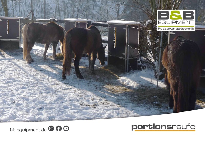 Guten Tag, der zeitgesteuerte automatischer Heuschrank für 4 Portionen zu. Mit der portionsraufe wird Ihr Pferd 24/7 optimal versorgt. Je nach Modell fasst die portionsraufe 6 - 8kg oder 10 - 12kg aufgelockertes Heu. Die Fütterungszeiten lassen sich kinderleicht einstellen. Die portionsraufe kann in der Box oder im Außenbereich stehen. An einer portionsraufe haben 2 oder 3 Pferde/Pony Platz, um in Ruhe ihr Heu zu fressen. Das Heu wird auf 4 Lagen verteilt und wird zu eingestellter Zeit freigegeben. Natürlich lassen sich auch andere Futtermittel wie z.B. Äpfel und Möhren füttern. Wir sind Ihr Partner für die zeitgesteuerte automatisierte Fütterung ihrer Tiere, ob Kraftfutter oder Raufutter. Wir freuen uns auf Ihre Nachrichten! B&B equipment GmbH Made in Germany