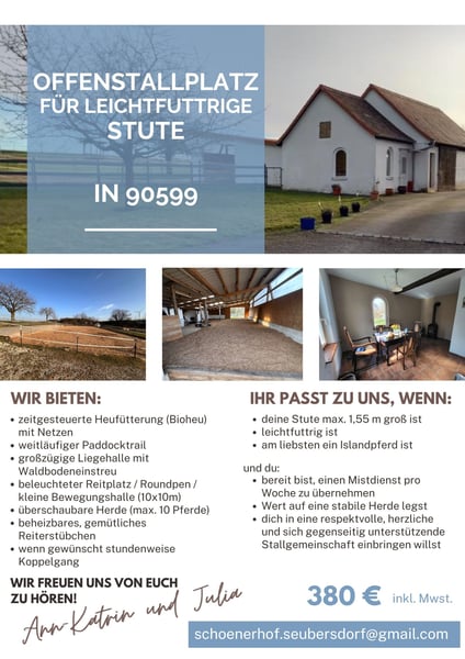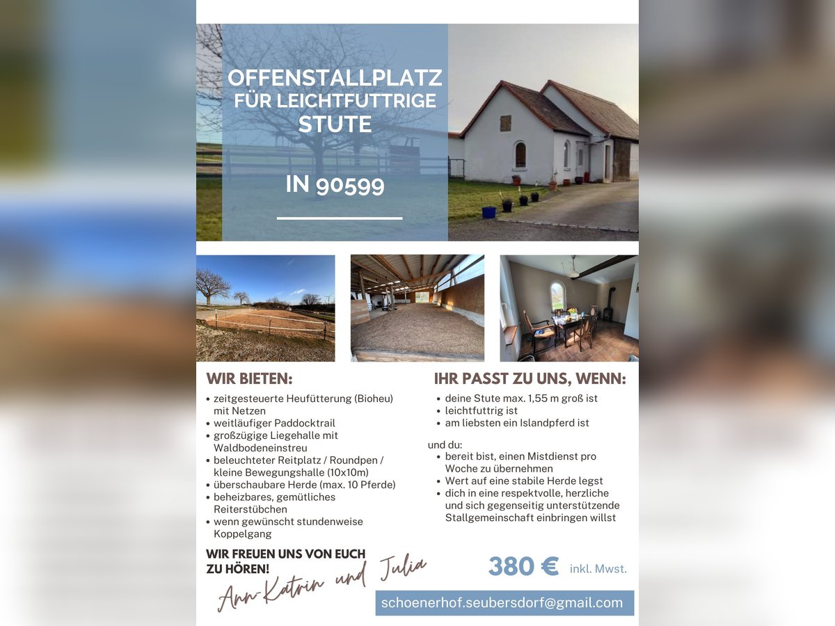 Wir bieten: -zeitgesteuerte Heufütterung (Bioheu) mit Netzen -rehegeeignet -weitläufiger Paddocktrail -großzügige Liegehalle mit Waldbodeneinstreu -beleuchteter Reitplatz / Roundpen / kleine Bewegungshalle (10x10m) -überschaubare Herde (max. 10 Pferde) -beheizbares, gemütliches Reiterstübchen -wenn gewünscht stundenweise Koppelgang Ihr passt zu uns, wenn: -deine Stute max. 1,55 groß ist -leichtfuttrig ist -am liebsten ein Islandpferd ist und du: -bereit bist einen Mistdienst pro Woche zu übernehmen -Wert auf eine stabile Herde legst -dich in eine respektvolle, herzliche und sich gegenseitig unterstützende Stallgemeinschaft einbringen willst