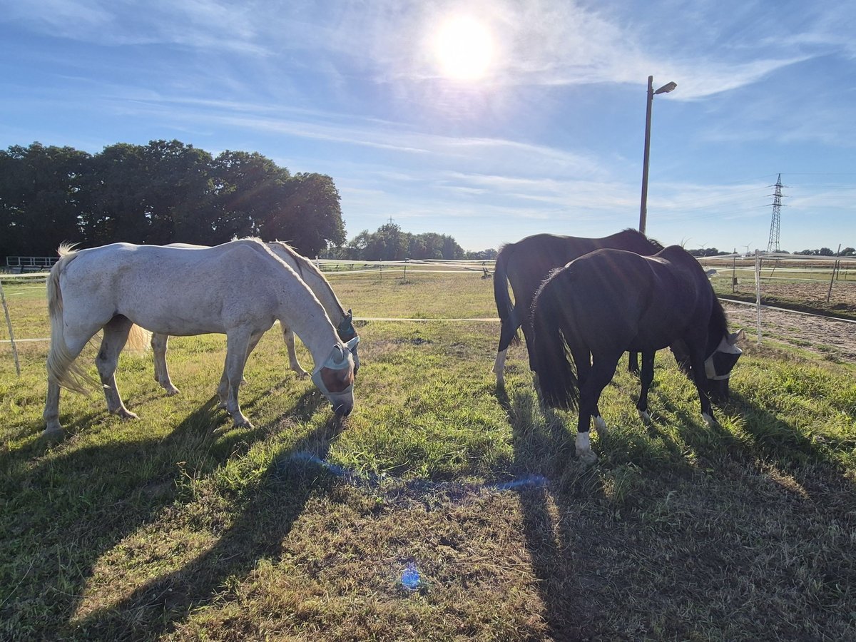 Wir sind eine kleine Gemeinschaft und haben noch Platz für 1 freundliches Pferd in unser kleinen gemischten Herde. Am liebsten eine Stute, aber ein sehr braver, rangniedriger Wallach wäre auch möglich. Aktuell stehen hier 1 Wallach und 4 Stuten. UNSER KONZEPT BERUHT AUF BEDARFSGERECHTER FÜTTERUNG NACH CONNY RÖHM!! Wir legen großen Wert auf viel Bewegung und pferdegerechter Fütterung, "innerhalb der Herde". Das heißt abgewogen und kontrollierte Fresspausen. Außerhalb der Herde steht jedem aber Heu und Stroh zur freien Verfügung bereit. Bei der Fütterung unterstützen wir uns alle, damit jedes Pferd individuell nach seinen Bedürfnissen versorgt wird. Das Hauptaugenmerk liegt auf der Fütterung von dicken Pferden, weil es davon einfach zu viele gibt. Aber auch alte/dünne Pferde werden bei uns durch die Mithilfe aller, zusätzlich zugefüttert und versorgt, damit der Besitzer nicht 7 Tage/Woche da sein muss. Wir füttern bedampftes Heu und Stroh (nur Weizen) aus Raufen mit Netz drüber, diese stehen auf trockenen befestigten Flächen. Es gibt verschiedene Offenställe/Unterstände/Zelt. Wir haben über 3 Hektar Land, wobei von April bis Nov./Dez. die Wiesen und der große Trail geöffnet ist und in der nassen Jahreszeit der kleinere Trail mit großem Paddock (1 Hektar), Hügel und Winterwiese. Wir haben aufgrund des großen Platzangebotes genügend trockene Böden, einen Hügel und genügend befestigte Fläche. Wir machen unser eigenes Heu, später 1. Schnitt, (ab und zu auch einen 2.ten) sodass wir nur wenig bis gar nichts zukaufen müssen. Das Heu wird durch die LUFA-Nordwest analysiert, damit ausgleichend mineralisiert werden kann. Das Pferd sollte also noch in der Lage sein, Heu zu fressen, aber auch Heucobs können wir 2-3 x täglich anbieten. Sollten wir zukaufen, werden wir seit Jahren vom gleichen Heulieferanten unterstützt. Jeder hat 1 festen Abenddienst und 1 festen Morgendienst pro Woche (an verschiedenen Tagen) - damit sind dann bei 6 Pferden 6 Tage abgedeckt. Den Morgen- und Abenddienst des 7. Tages teilen wir immer fair auf. Auch da unterstützen wir uns alle. Wir haben einen höher gelegenen Reitplatz der beleuchtet ist und ein beleuchtetes Roundpen. Ein Waschplatz ist vorhanden, Solebox in Planung und es ist Platz für einen Schrank. Entwurmt wird selektiv, nach Kotproben in einem zertifizierten Labor. Der Mist wird 4 x Jahr abgefahren, da werden die Kosten einfach durch alle Pferde geteilt, was wirklich nicht ins Gewicht fällt. Hunde sind herzlich willkommen, insofern sie sozialisiert sind. Wenn Du dich angesprochen fühlst, melde Dich einfach :-)