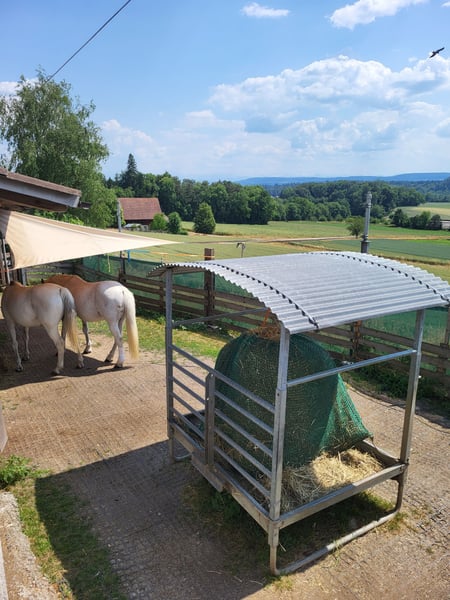 En un hermoso entorno de equitación, hay espacio en un paddock al aire libre para un caballo de hasta 1,60 m de altura, con casco desnudo, junto a dos Trakehner blancos y una raza española (una yegua y un semental). Pequeño paddock con acceso directo a 1 hectárea de pasto, abierto durante 360 días al año. Heno de producción propia, disponible en un comedero cubierto, accesible las 24 horas del día, los 7 días de la semana. Zona de descanso con suelo de bosque y cama de material vegetal. El equipo y accesorios tienen espacio en la sala de descanso para jinetes, que cuenta con aseo. Se ofrece un precio muy económico de 450 CHF/mes en caso de ayuda en el establo. Para consultas, contacta al 076 250 1123.