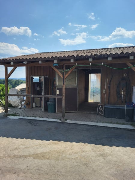 Na pięknym terenie jeździeckim znajduje się wolna stajnia z wybiegiem, przeznaczona dla konia o wzroście do 160 cm, z kopytami naturalnymi, obecnie zamieszkująca dwie białe klacze Trakehner oraz hiszpańską rasę (klacz i ogier). Mała stajnia otwarta z bezpośrednim dostępem do 1-hektarowego pastwiska, dostępnego przez 360 dni w roku. Siano z własnej produkcji, dostępne w siatce na siano, 24/7. Strefa wypoczynkowa z podłożem z leśnej ściółki. Dodatkowe wyposażenie ma miejsce w stajni dla jeźdźców, dostępna toaleta. Przy pomocy przy pracach w stajni można uzyskać bardzo korzystną cenę 450 zł miesięcznie. Odpowiedzi na pytania pod numerem 076 250 1123.
