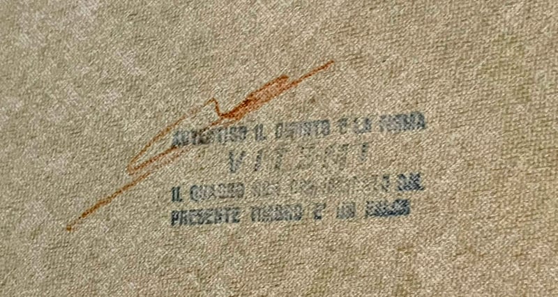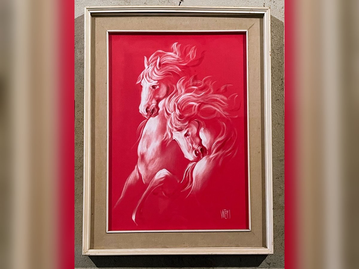 Affascinante dipinto originale della pittrice italiana Roberta Vitemi, artista nota per la sua capacità di catturare l'energia e il vigore del mondo equino. L'opera, risalente al periodo 1970-1980, è un esempio emblematico dello stile "fiammeggiante" dell'autrice. Soggetto: Due cavalli resi con un tratto bianco / chiaro tipico dell'autrice che dona movimento e vigore ai soggetti dinamici e vibranti che emergono con forza da un fondo rosso lacca saturo. Tecnica: Olio o tecnica mista su tela. Dimensioni della tela: 50 x 70 cm. Dimensioni totali (con cornice): 62,5 x 83 cm. Profondità della cornice: 5,5 cm (cornice importante e profonda che dona grande tridimensionalità). Stato di conservazione: Eccellente. Colori vividi, tela perfettamente tesa. La cornice originale dell'epoca presenta minimi e fisiologici segni del tempo che ne confermano l'autenticità. Autenticità garantita: L'opera è firmata sul fronte in basso a destra. Sul retro della tela è presente il timbro originale di autenticità dell'artista con sigla autografa di verifica, elemento fondamentale che ne certifica l'originalità e ne tutela il valore nel tempo. Un pezzo d'arredamento di grande carattere, perfetto per valorizzare ambienti moderni, studi professionali o collezioni di arte equina e modernariato italiano. Il quadro viene venduto completo della sua cornice originale dell'epoca, inclusa nel prezzo, che ne esalta lo stile vintage. Un pezzo d'arredamento di grande carattere, perfetto per saloni o studi. "Eredità familiare, quadro conservato con cura in ambiente asciutto e non fumatori". --------------------------------------------------------------------------------------------------------------------------------------------- Stunning original painting by the Italian artist Roberta Vitemi, renowned for her ability to capture the energy and vigor of the equine world. This piece, dating back to the 1970s-1980s, is a quintessential example of the artist's "flaming" style. Key Features: Subject: Two horses rendered with a dynamic and vibrant white stroke that emerges powerfully from a deep, saturated lacquer red background. Technique: Oil or mixed media on canvas. Canvas Dimensions: 50 x 70 cm. Total Dimensions (including frame): 62.5 x 83 cm. Frame Depth: 5.5 cm (a significant, deep frame that provides great three-dimensionality). Condition: Excellent. Vivid colors, perfectly taut canvas. The original vintage frame shows minimal and natural signs of age, confirming its authenticity. Guaranteed Authenticity: The work is signed on the front (bottom right). On the back of the canvas, there is the artist's original stamp of authenticity, along with a handwritten verification mark, a fundamental element that certifies its originality and protects its value over time. A high-character piece of decor, perfect for enhancing modern interiors, professional offices, or collections of equine art and Italian mid-century design. "Family inheritance; painting carefully preserved in a dry, smoke-free environment."
