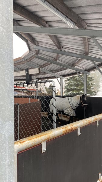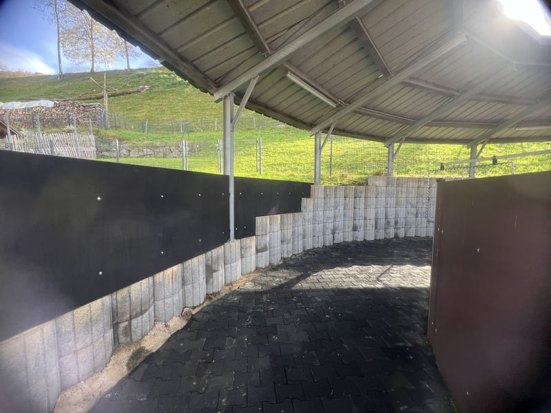 Verkaufe unsere wenig genutzte, überdachte Pferde-Führanlage für 4 Pferde. Bei uns hat sie einen Aussendurchmesser von 14 Meter. Sie wäre aber variabel zwischen 13 und 16 Metern aufbaubar. Zu beachten ist, dass die Aussenumrandung und somit auch die Dachgrösse, speziell für uns konstruiert wurde da die Anlage in den Hang gebaut wurde. Die Anlage muss selber abgebaut und abtransportiert werden!!! Mithilfe von uns kann angeboten werden. Die komplette Führanlage ist bestehend aus: Führmaschine 4'000.00 Lauffläche aus Gummi-Pflastersteinen 500.00 Überdachung 5'500.00 Innenbegrenzung aus Siebdruck-Platten und 17 verzinkten 2 Zoll Rohren Aussenumrandung aus Schalholz Massives Eingangstor (hat Wetterbedingte Gebrauchsspuren) s. Bilder Seitliche Stützen für die Dachkonstruktion (9 x gleiche + 8 x unterschiedliche Längen) Dachkonstruktion aus Eisenträgern, Holzbalken, Trapezblech + Beleuchtung = Gesamtpreis 10'000.00 Der Preis ist VHB. Bevorzugt werden Komplett-Abnehmer. Privatverkauf. Keine Garantie oder Rücknahme.