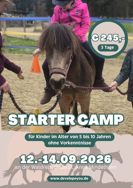 12.-14.9.26 Das Starter Camp richtet sich an Vorschulkinder und Schulkinder bis ca 10 Jahre. An drei Tagen werden Ihnen in kleinen Gruppen die Basics an und auf dem Pony gezeigt. Es erwarten euch: + 5 Einheiten an und auf dem Pony + erlernen der Pony Pferdesprache + bewusste Sinnes- und Körperwahrnehmung zusammen mit dem Pony + sowie kreative Angebote rund ums Thema Pferd Ziel ist nicht nur das harmonische Zusammenspiel zwischen Mensch/Mensch und Mensch/Tier, sondern auch die wichtigen Fähigkeiten spielerisch zu trainieren die für die Schule so wichtig sind: + Aufmerksamkeit schenken und bekommen + Grenzen setzen und wahren + und Disziplin fordern und selber diszipliniert sein. Wir freuen uns drei wunderbare Tage auf dem Ponyhof mit den Kindern! Kostenpunkt sind € 245,-. Los geht es um 10 Uhr am Hof und die Kinder können um 16 Uhr wieder abgeholt werden. Veranstaltungsort ist die idyllisch gelegene Waldreitschule Litte Horse Ranch St. Anna bei Mindelheim. Anmeldungen bitte direkt über die Homepage: https://www.developeyou.de/Kontakt/Anmeldung-Reitcamp/