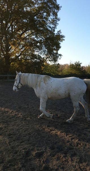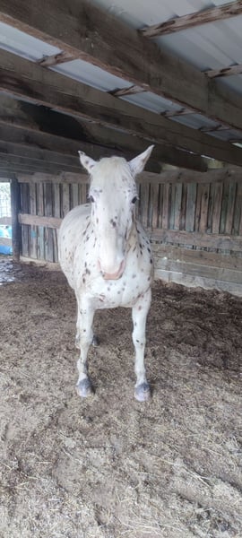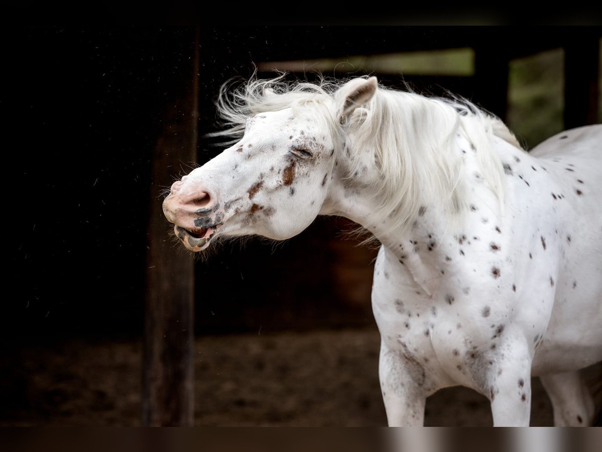 De ruin is 10 jaar oud en bevindt zich sinds zijn anderhalfde levensjaar in mijn bezit. Hij is een Knabstrupper-Appaloosa-mix met een stokmaat van 1,60 m. Hij wordt uitsluitend afgestaan aan een echt goede en paardenpassende thuis. Een koopcontract en een recht van eerste koop blijven voorbehouden. De ruin wordt momenteel recreatief in het Engels gereden. Ik kan me echter goed voorstellen dat hij zich ook in de westernsport thuis zou voelen en daar goed zou kunnen ontwikkelen. Hij houdt erg van koeien. In de kudde staat hij in het midden qua rang. In de omgang kan hij veeleisend zijn. Hij is vaak onzeker en heeft een rustige, ervaren persoon nodig die hem vertrouwen geeft. In een stabiele omgeving toont hij zich betrouwbaar, fijn en gevoelig. Hij is nieuwsgierig, geïnteresseerd en werkwillig, wordt graag geborsteld en geniet van alle vormen van aandacht en genegenheid. Hij kent geen nauw of longeerlijn en is daarom geen paard voor rijscholen, beginners of onervaren ruiters. Kinderen accepteert hij alleen als ze al over gedegen paardenervaring beschikken. In stresssituaties kan hij trappen, daarom is een veilige en vooruitziende omgang vereist. Hij is drievoudig drager van PSSM type 1. Ondanks het hele jaar door weiden (365 dagen per jaar) zijn er nooit problemen geweest. Ik zou hem ook kunnen aanbieden voor beschikbaarheid. Bij serieuze interesse en voldoende ervaring hoor ik graag van u.