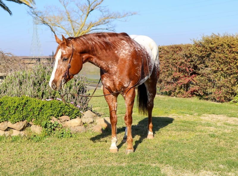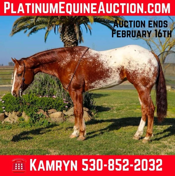 ONLINE AUCTION Place your bids at www.PlatinumEquineAuction.com Starting Bid $3500 Auction ends February 16th, 2025 Need a new saddle? Check out White Rock Saddles on our website or Facebook! If you’re looking for a horse that turns heads wherever he goes, AppleJax is your guy! Applejax is a beautiful 15.2H, 10 year old, Appaloosa gelding. This stunning gelding is the definition of fancy, with flawless movements and an impressive potential into show background. He was started in a reining program and has all the maneuvers you could ask for— a big, effortless slide stop, smooth spins, flying lead changes, and a low, collected headset. He moves with elegance and precision, making him an outstanding prospect for someone wanting to take him into the show pen. Beyond the arena, AppleJax is also an excellent trail partner. He’s confident and surefooted, handling rough terrain with ease. He crosses water, logs, and uneven ground without hesitation. He’s been exposed to cars, semis, livestock, wildlife, dogs, and quads, and he takes everything in stride, never overreacting. Whether you want to compete or just enjoy a stylish ride out on the trails, AppleJax is ready to go in any direction. This boy is a pleasure to have in the barn. He stands quietly for grooming, tying, saddling, and the farrier. He loads into the trailer with ease and is always eager to go on new adventures. AppleJax has been handled with care and is well-mannered, making him a joy to be around both in and out of the saddle. Due to his advanced training AppleJax isn’t recommended to be in a beginner home. He has all the buttons and responsiveness that make him an incredible athlete, but he needs a rider who can appreciate and utilize his talents to their fullest potential. If you’re searching for a high-quality, well-trained horse that is as fancy as they come, AppleJax is the one for you. He’s got the looks, the talent, and the versatility to excel in whatever you ask of him. Don’t miss your chance to own this exceptional horse! Located in Pleasant Grove, CA. Please contact Kamryn at KW Ranch 530-852-2032! ONLINE AUCTION Place your bids at www.PlatinumEquineAuction.com Starting Bid $3500 Auction ends February 16th, 2025 Need a new saddle? Check out White Rock Saddles on our website or Facebook!