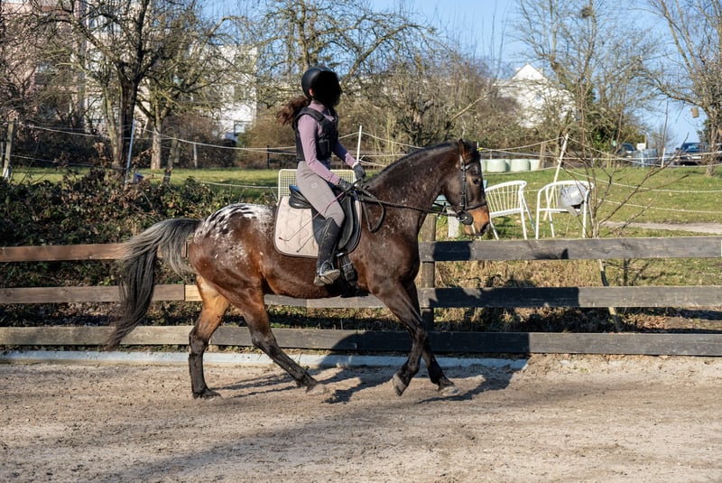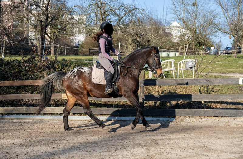 Spirit ist ein 13 jähriger Appaloosa-Araber-Mix. Er ist 1,60 m groß und stabil gebaut. Spirit ist ein cleveres Kerlchen, der Beschäftigung in jeder Form liebt. Gern geht er ins Gelände, geht mutig voran, lässt sich aber auch hinten oder in der Mitte reiten. Spirit hat viel Pepp und möchte gern jeden Tag bewegt und ausgelastet werden. Dressurmäßig ist er auf auf A/L Niveau. Seitengänge im Schritt und Trab sind abrufbar. Er kann bei korrekter Hilfengebung sehr schön in Beizäumung gehen und macht eine schicke Figur dabei. Stangenarbeit und springen kennt Spirit auch, wobei schon kleine Hindernisse gern höher nimmt und natürlich bei hohen Sprüngen dann zur Hochform aufläuft. Für geübte Springer ist er eine Freude, da er den Willen hat drüber zu kommen. Spirit ist ein Pferd welches sich sehr gut auf die Energie des Reiters einstellt und sich dementsprechend reiten lässt. Er möchte gerne von den Reiterhilfen begleitet und eingerahmt werden. Wir haben Spirit vor 3 Jahren von privat für unseren Reitbetrieb gekauft. Er hat keine Probleme mit wechselnden Reitern und unterschiedlichen Reitniveaus. Wir setzen ihn gern in den Dressurstunden und bei Ausritten ein. Auch bei den Anfängern, die noch zu zweit im Schritt reiten, ist er super brav und bemüht. Für Galopp- und Springanfänger ist er leider zu fleißig und engagiert. Und genau deshalb haben wir uns entschieden für ihn ein besser passendes Zuhause zu suchen. Unser Reitbetrieb entwickelt sich seit diesem Jahr mehr in die Richtung des Anfänger-Unterrichts und wir merken, dass Spirit unterfordert ist und viel mehr in ihm steckt, als wir von ihm brauchen. Deswegen möchten wir ihm jetzt, wo er noch so jung ist, eine Chance geben einen passenderen Menschen zu finden, der ihn fordern und fördern kann. Spirit steht bei uns in einer gemischten Herde und ist mit allen sehr verträglich. Er ist sehr verspielt und freundet sich mit jedem an ohne dominant zu sein. Wir geben Spirit Heulage, da er mit unserem Heu hustet. Die Vorbesitzer hatten mit Husten keine Probleme. Im Sommer trägt Spirit wegen der empfindlichen Appaloosa-Augen dauerhaft eine Maske, was ihm sehr gut gegen die UV-Strahlung hilft. Im Frühling, Herbst und Winter hat er keine Maske an. Wir können uns Spirit nach wie vor in einem pferdegerechten Reitschulbetrieb mit artgerechter Haltung vorstellen. Da wir Befürworter des Reitens ohne Hilfszügel sind, käme für uns auch nur ein Reitschulbetrieb infrage, der die gleiche Meinung vertritt. Wir können uns Spirit sehr gut in den fortgeschrittenen galoppsicheren Reitstunden vorstellen, sowohl in der Dressur als auch beim Springen. Für ein Probereiten berechnen wir 50€. Weitere Infos und Fotos zu unserem Reitclub finden Sie auf www.reitclub-kronberg.de Wir sind auch auf Instagram zu finden: https://www.instagram.com/reitclub.kronberg?utm_source=ig_web_button_share_sheet&igsh=ZDNlZDc0MzIxNw==