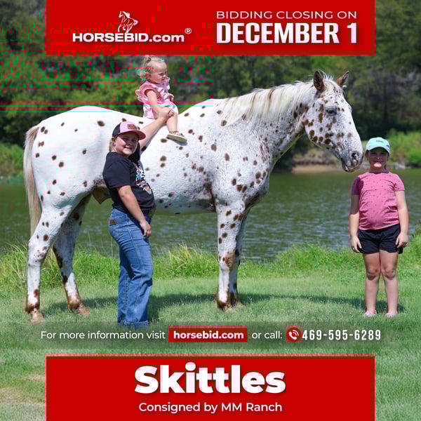 ⚜️ 𝓽𝓱𝓮 𝐇𝐨𝐫𝐬𝐞𝐦𝐚𝐧'𝐬 𝓢𝓱𝓸𝔀𝓬𝓪𝓼𝓮⚜️ Happening now thru MONDAY | DECEMBER 1st - Available EXCLUSIVELY on HorseBid's website! For more details and to register visit: www.Horsebid.com CONSIGNOR CONTACT: MM RANCH 469-595-6289 LOCATION: Forney, TX BREED: Appaloosa REGISTERED: No COLOR: Leopard Appaloosa HEIGHT: 15 AGE: 15 GENDER: Gelding If you are looking for a safe, reliable, and truly versatile gelding, look no further — Skittles is the one. This drop dead gorgeous leopard Appaloosa gelding is the definition of bombproof. 💣 Skittles is just 12 years old. Stands 15 hands tall. Gentle, quiet, and dependable in EVERY WAY, he is the type of horse that is hard to come by and even harder to let go of. Skittles has been ridden both English and Western, making him suitable for a wide variety of riders and disciplines. Whether you want to enjoy a relaxing trail ride, riding on the ranch and checking cattle, riding in the arena, or even dabble in English work, he has the mindset to adapt to whatever you ask of him. He has also been roped on outside the arena, and handles the job with ease and willingness. 💥💥 He is the same horse every time you saddle him. Skittles rides off quietly, neck reins, and stays soft in the bridle. He will walk, trot, and lope on a loose rein, and steps up willingly when asked without ever being hot or hard to handle. Out on the trails, he is steady and sure-footed. He crosses water, handles rough terrain, and doesn’t spook at the unexpected. Whether you ride alone or in a group, Skittles stays calm, making him an ideal choice for anyone who values safety and confidence in their horse. 👉🏼👉🏼 Skittles has the kind of mind and disposition that makes him suitable for any rider. He is kind and forgiving for someone learning, yet broke and responsive enough for an experienced hand to enjoy. His versatility, striking color, and absolute gentleness make him a standout gelding you can trust in any situation. ⚡️⚡️He is sound in every way!!!! Up to date on shots. He is healthy with no issues and no maintenance. He is ready to go to his new home. 🏠 We can and will help arrange shipping anywhere at an affordable rate. So you can get him to your new home.