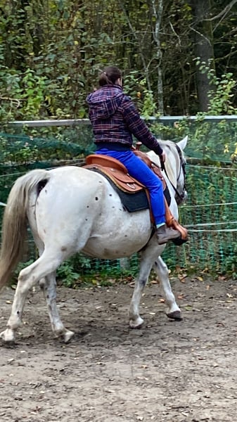 Appaloosa - Huzulenmix als bedingt reitbarer Beisteller zu verkaufen. Er ist der ideale Partner für entspannte Ausritte, wenn weitere Pferde mit dabei sind, mag er es auch mal flotter. Er liebt Bodenarbeit und mag gerne am Mähnenansatz gekrault werden, ansonsten ist er eher nicht so der Kuscheltyp.. Als Führpferd mit Kindern oder Erwachsenen drauf macht er einen guten Job. Milow hat momentan Sehnenbeschwerden und braucht wegen Hohlräumen an den Hinterhufen regelmäßig Hufpflege. Kleinere Ausritte sind trotzdem möglich. Milow ist ranghoch, in Gesellschaft mit größeren Pferden ist dies aber kein Problem. Er sollte im Offenstall stehen, in der Box wird ihm schnell langweilig. Wir wünschen uns für ihn einen guten Endplatz, der Verkauf erfolgt wegen Bestandreduzierung.